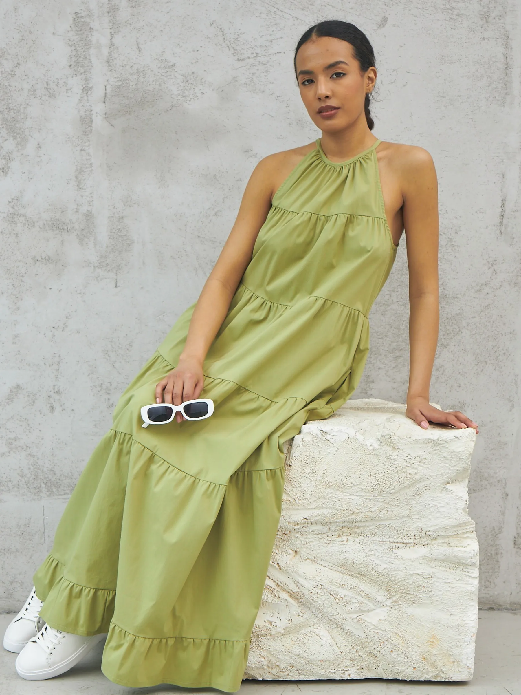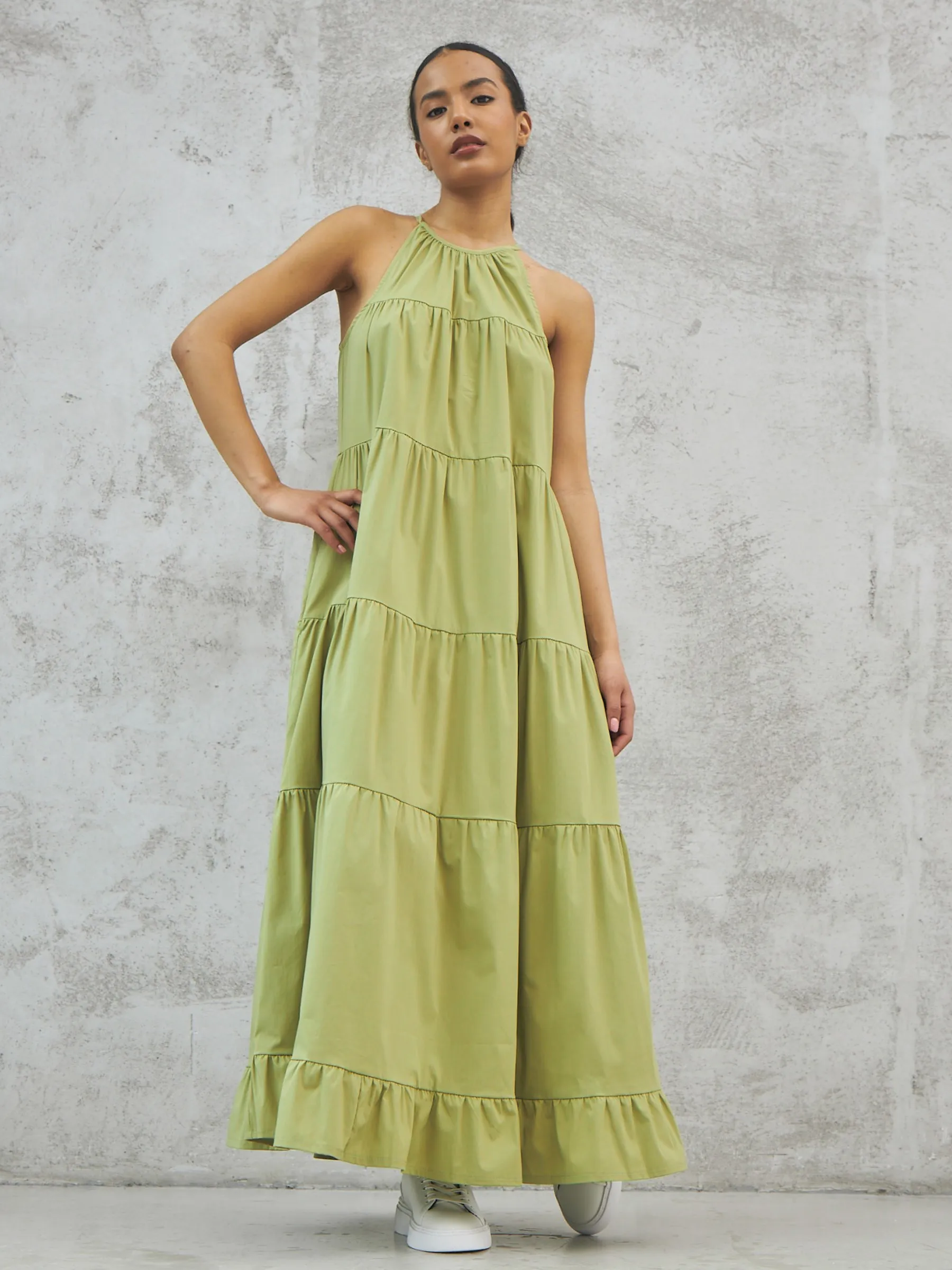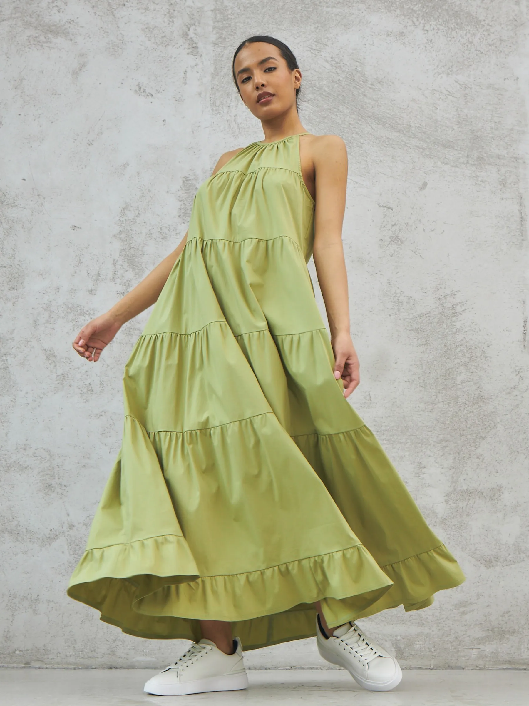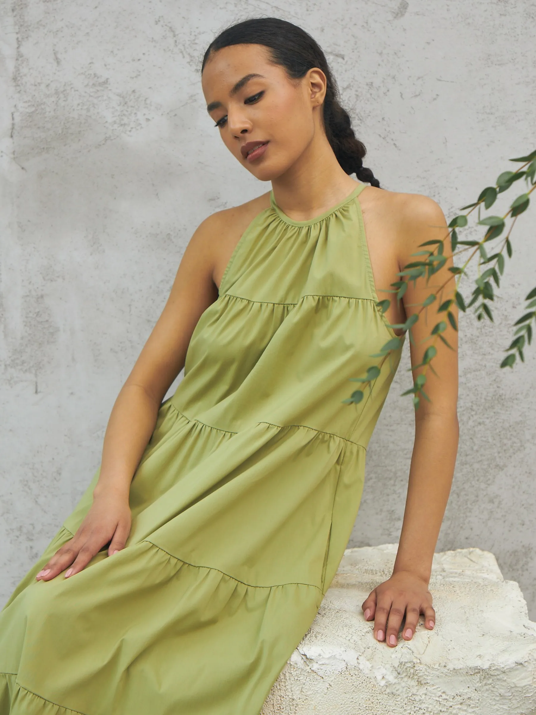 Макси платье из экологичного хлопка на застежке с незаметными карманами и мягкими воланами, создающими нежный эффект. Для большей практичности и эластичности в ткань добавлены волокна нейлона и эластана, не ухудшающие комфорт во время носки. Платье без рукавов идеально для отдыха.