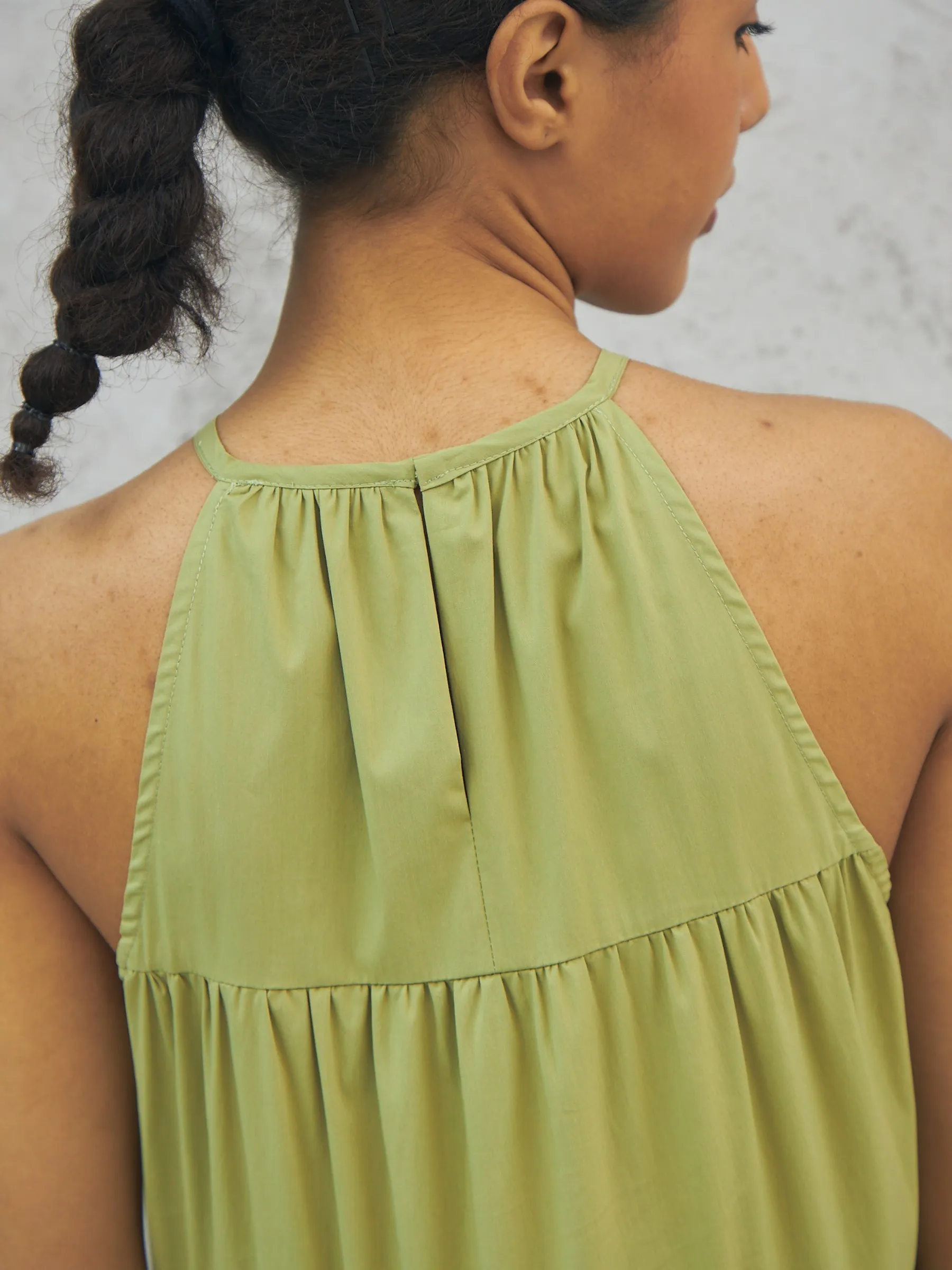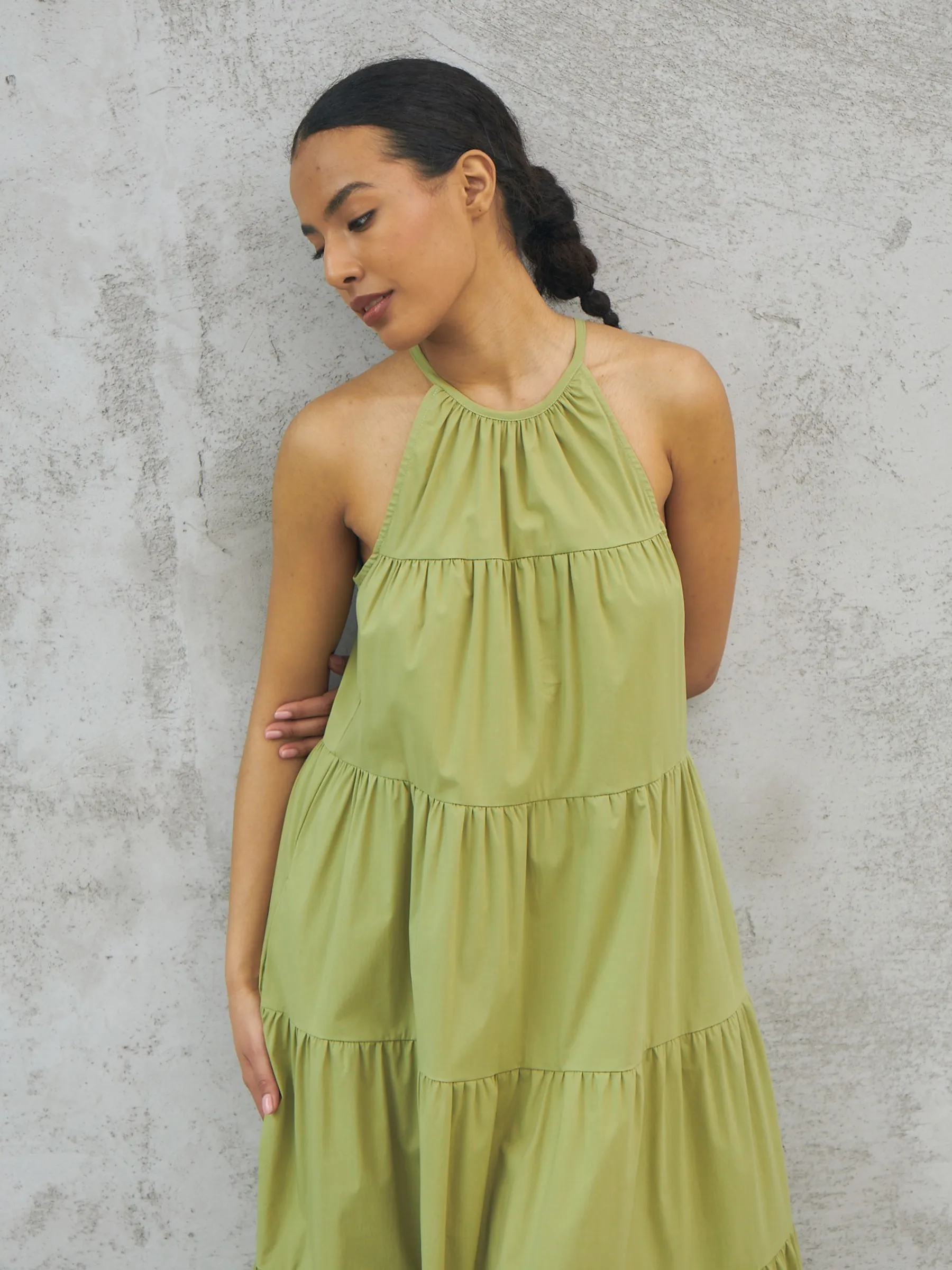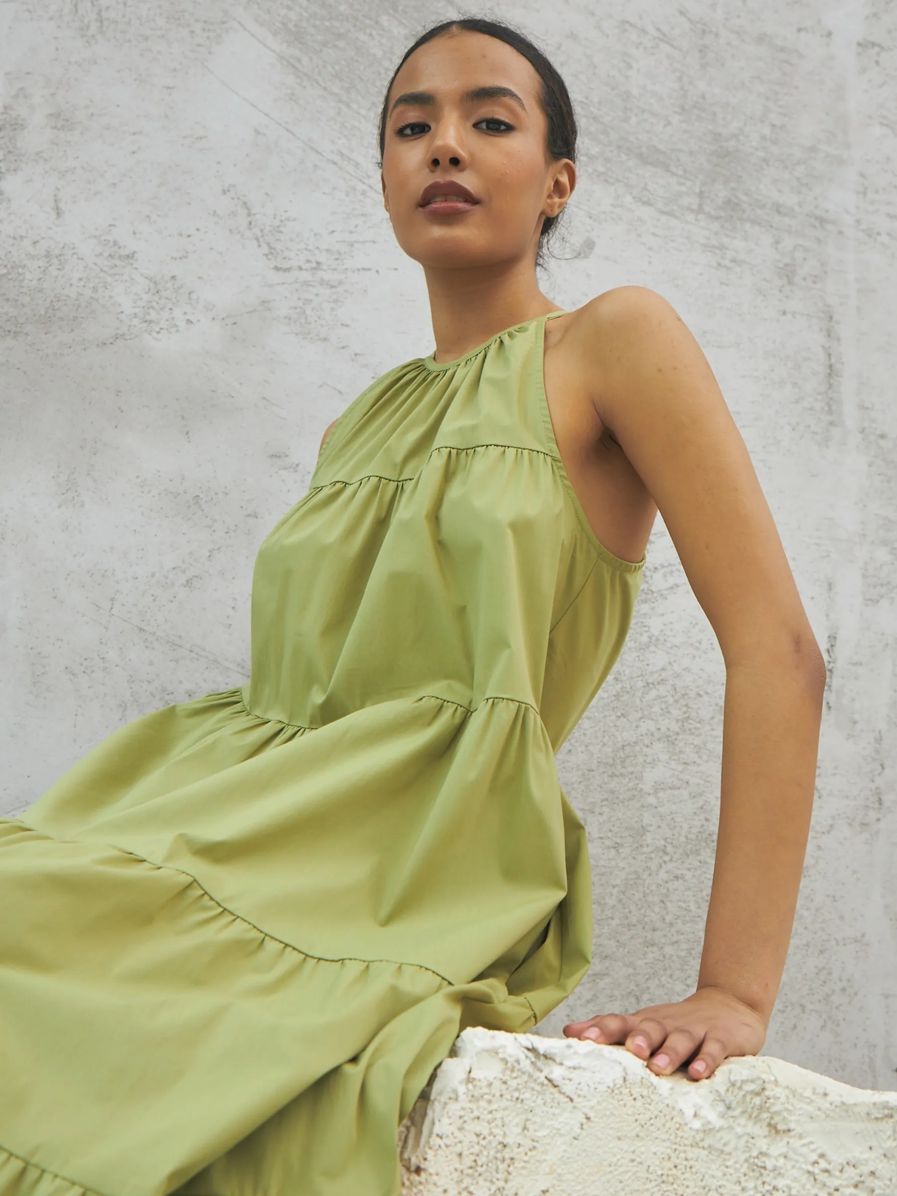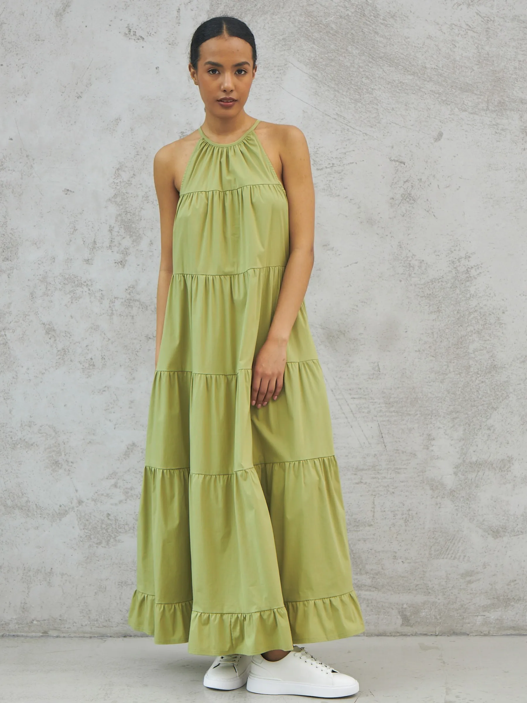 Макси платье из экологичного хлопка на застежке с незаметными карманами и мягкими воланами, создающими нежный эффект. Для большей практичности и эластичности в ткань добавлены волокна нейлона и эластана, не ухудшающие комфорт во время носки. Платье без рукавов идеально для отдыха.