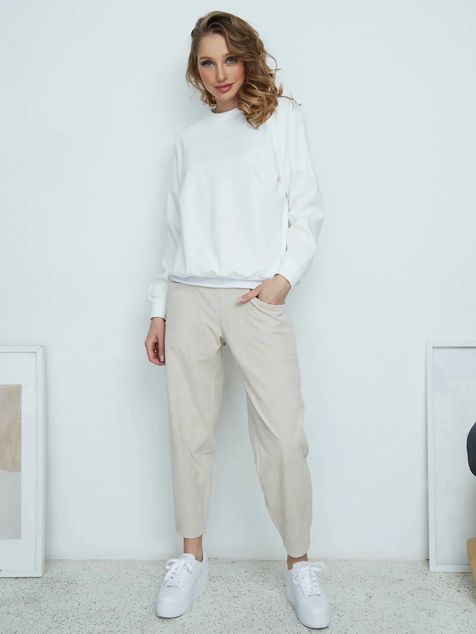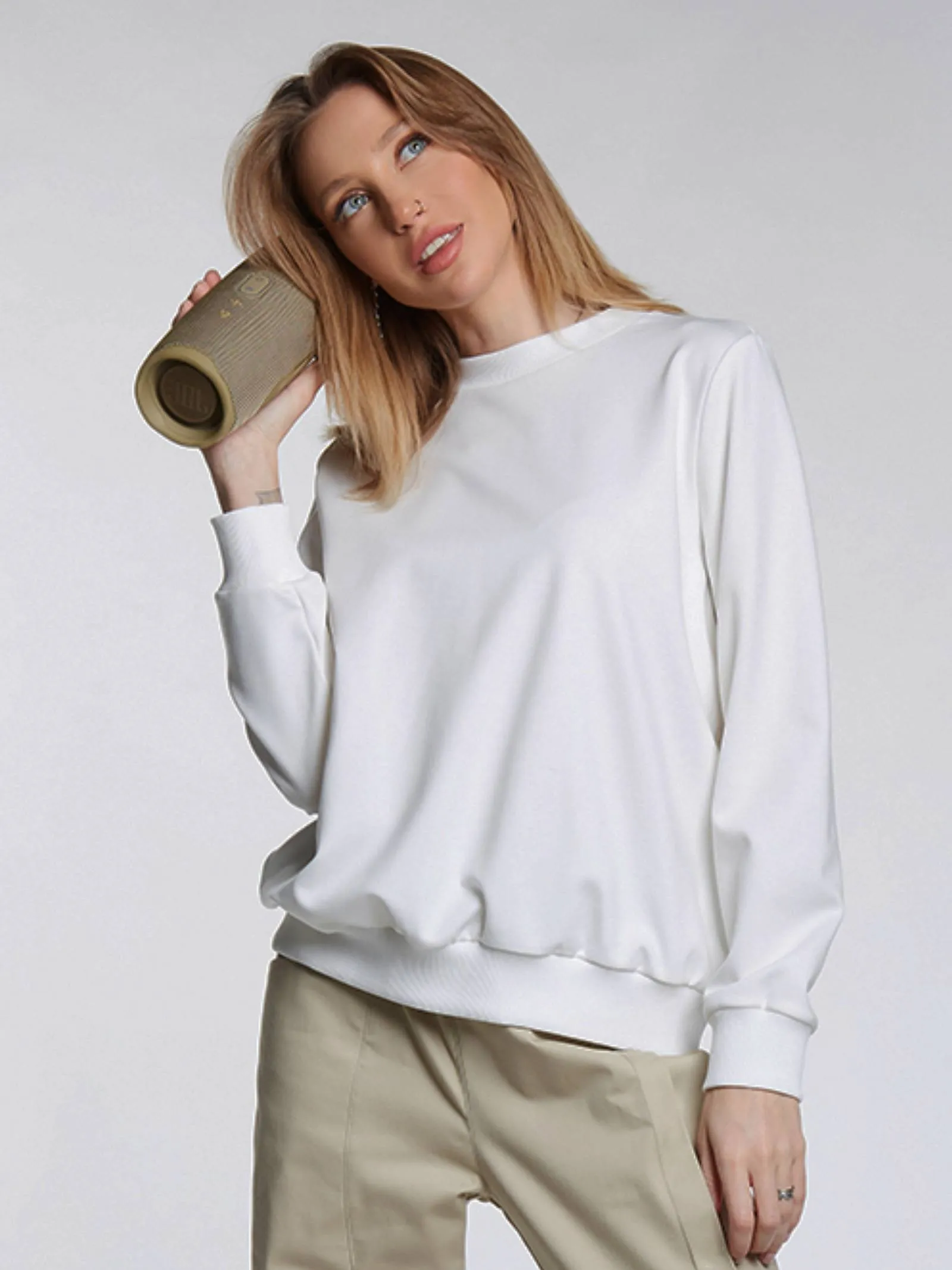 Свитшот универсальный для стильных девушек, эта модель подходит всем. Благодаря манжетам на рукавах, их можно поднять до локтя. Свитшот свободного кроя, не будет сковывать ваши движения. Создан из приятной практичной ткани, которая не мнется. Под образ подойдут свободные брюки, леггинсы и обувь на платформе или кроссовки.