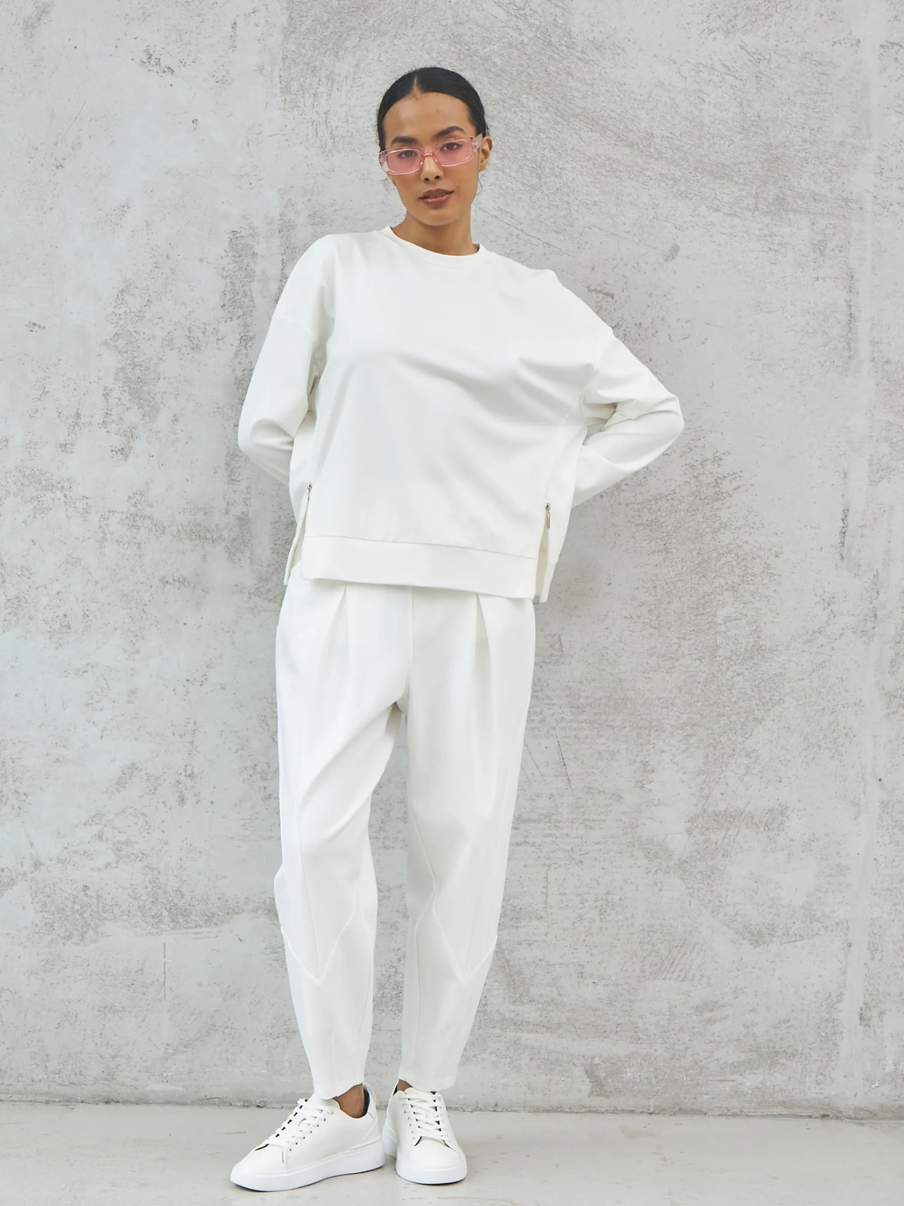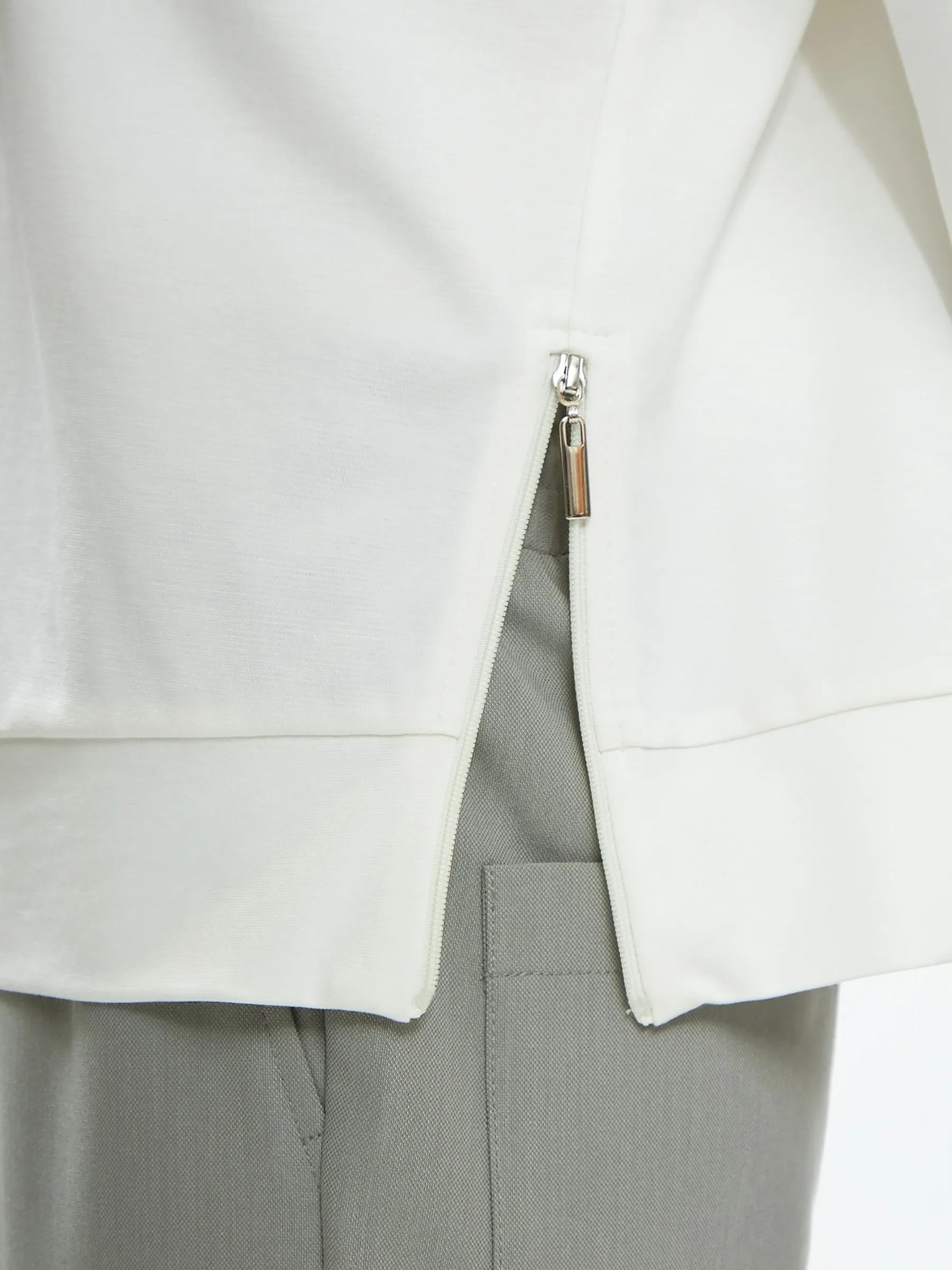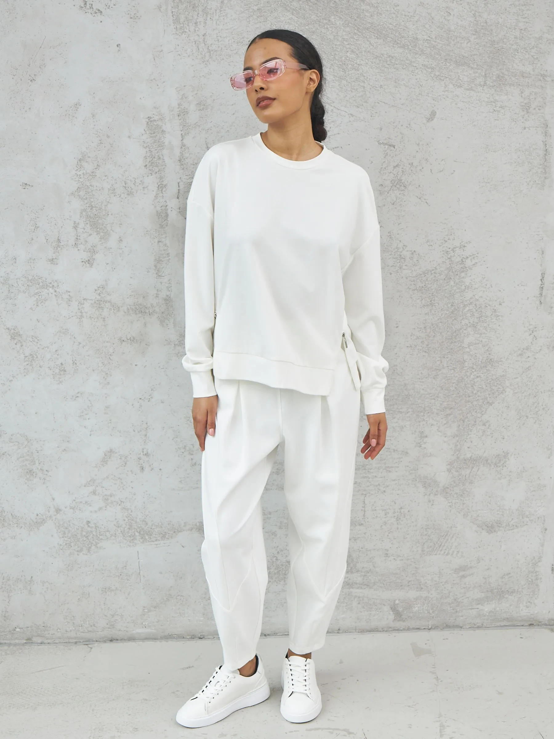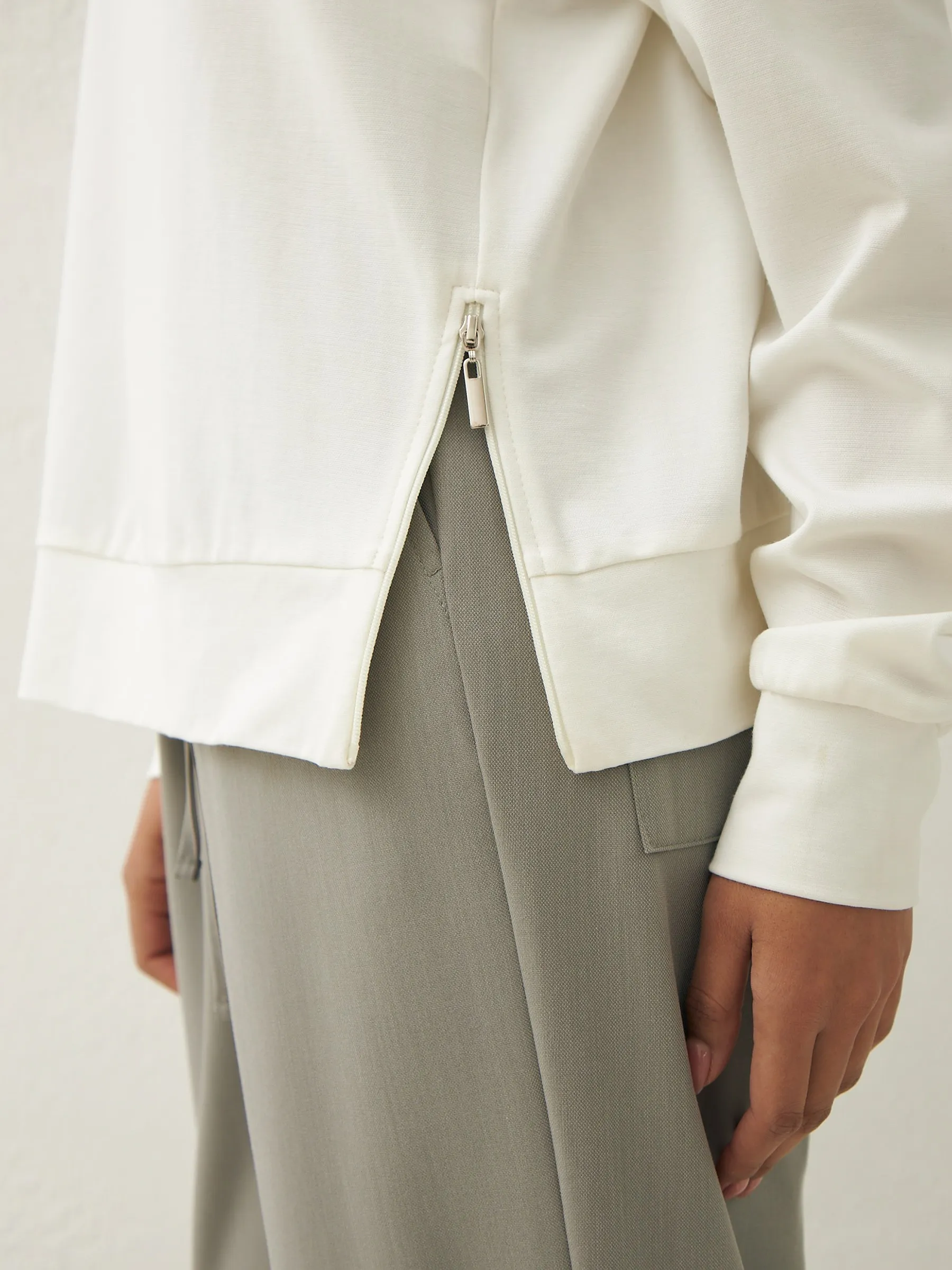 Мягкий свитшот с круглым вырезом, широкими манжетами и двумя декоративными молниями сбоку, которые вы можете носить как в застегнутом, так и в расстегнутом виде. Модель выполнена из нежной вискозы, прочного нейлона и тянущегося эластана в молочном оттенке. Подойдет для создания удобных повседневных сочетаний с кэжуал брюками.