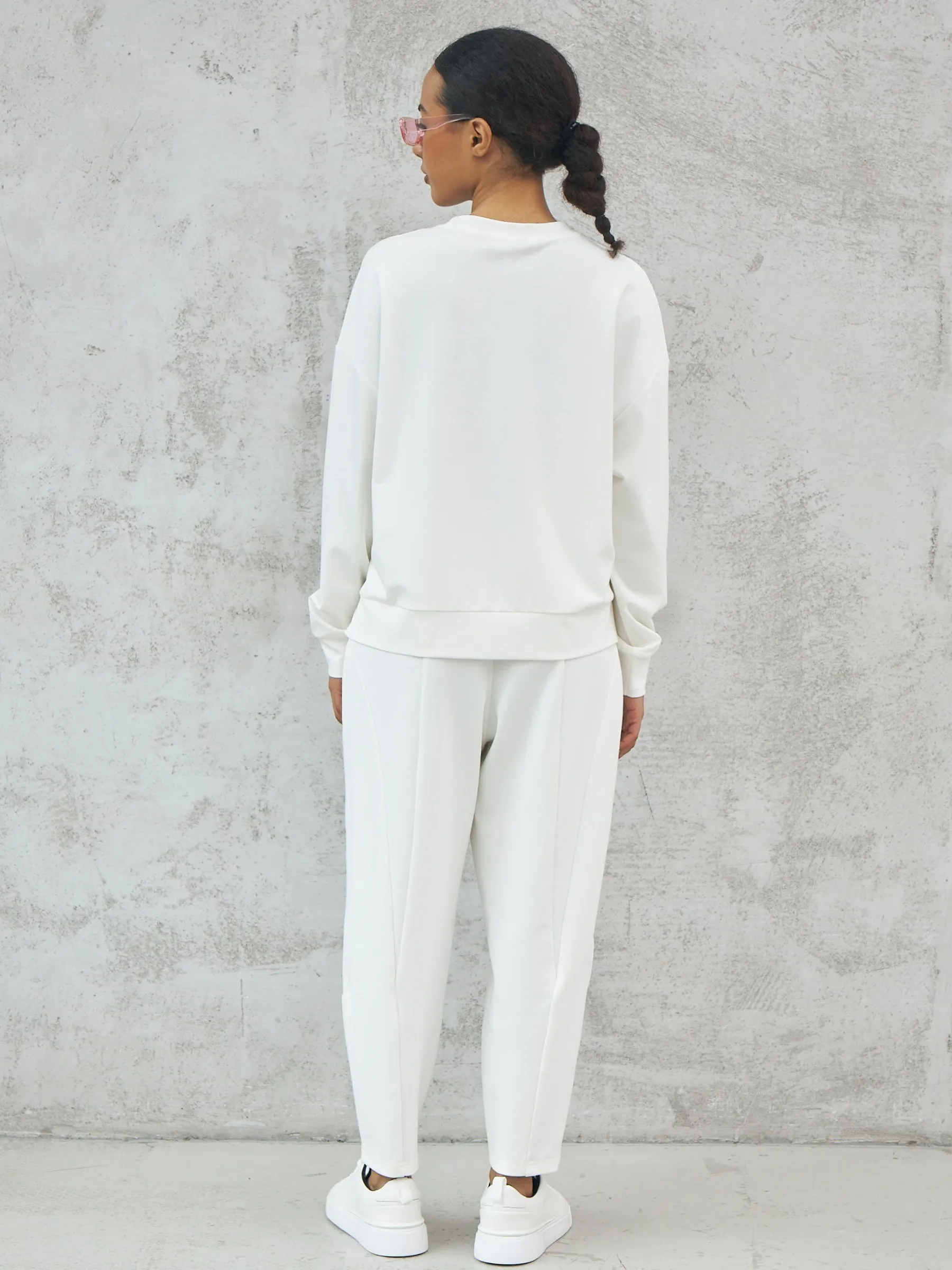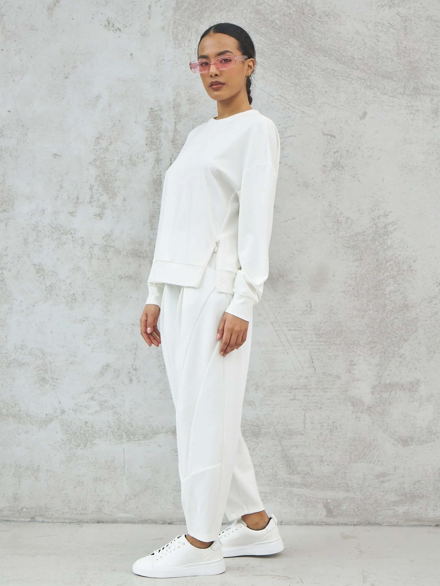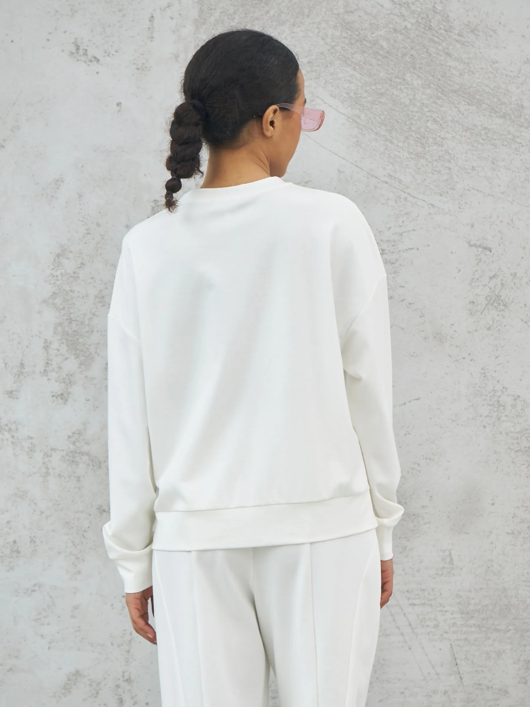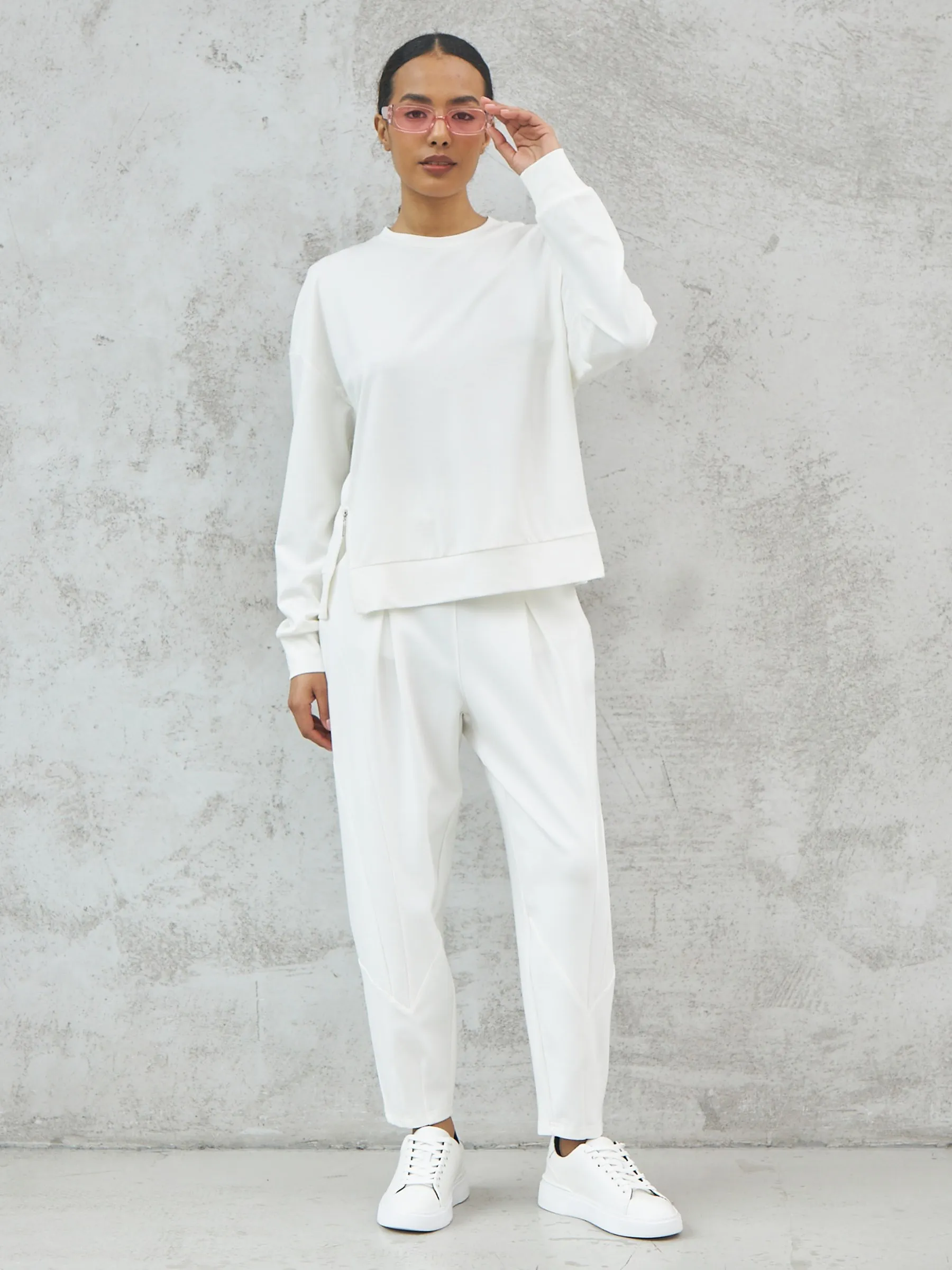 Мягкий свитшот с круглым вырезом, широкими манжетами и двумя декоративными молниями сбоку, которые вы можете носить как в застегнутом, так и в расстегнутом виде. Модель выполнена из нежной вискозы, прочного нейлона и тянущегося эластана в молочном оттенке. Подойдет для создания удобных повседневных сочетаний с кэжуал брюками.