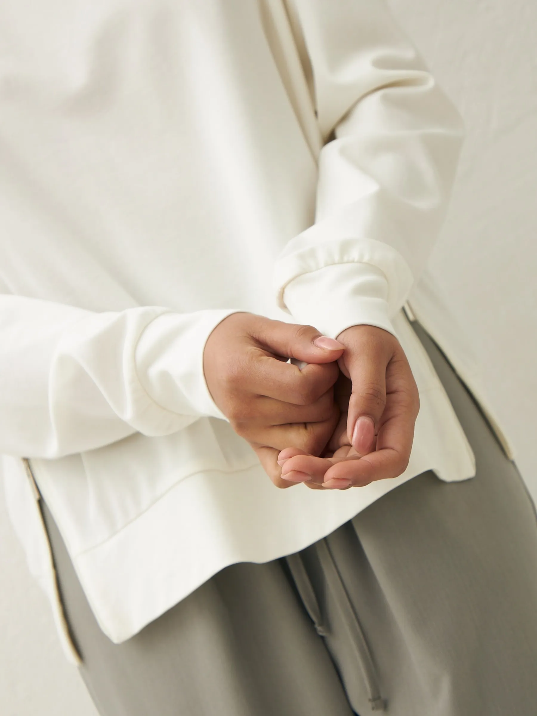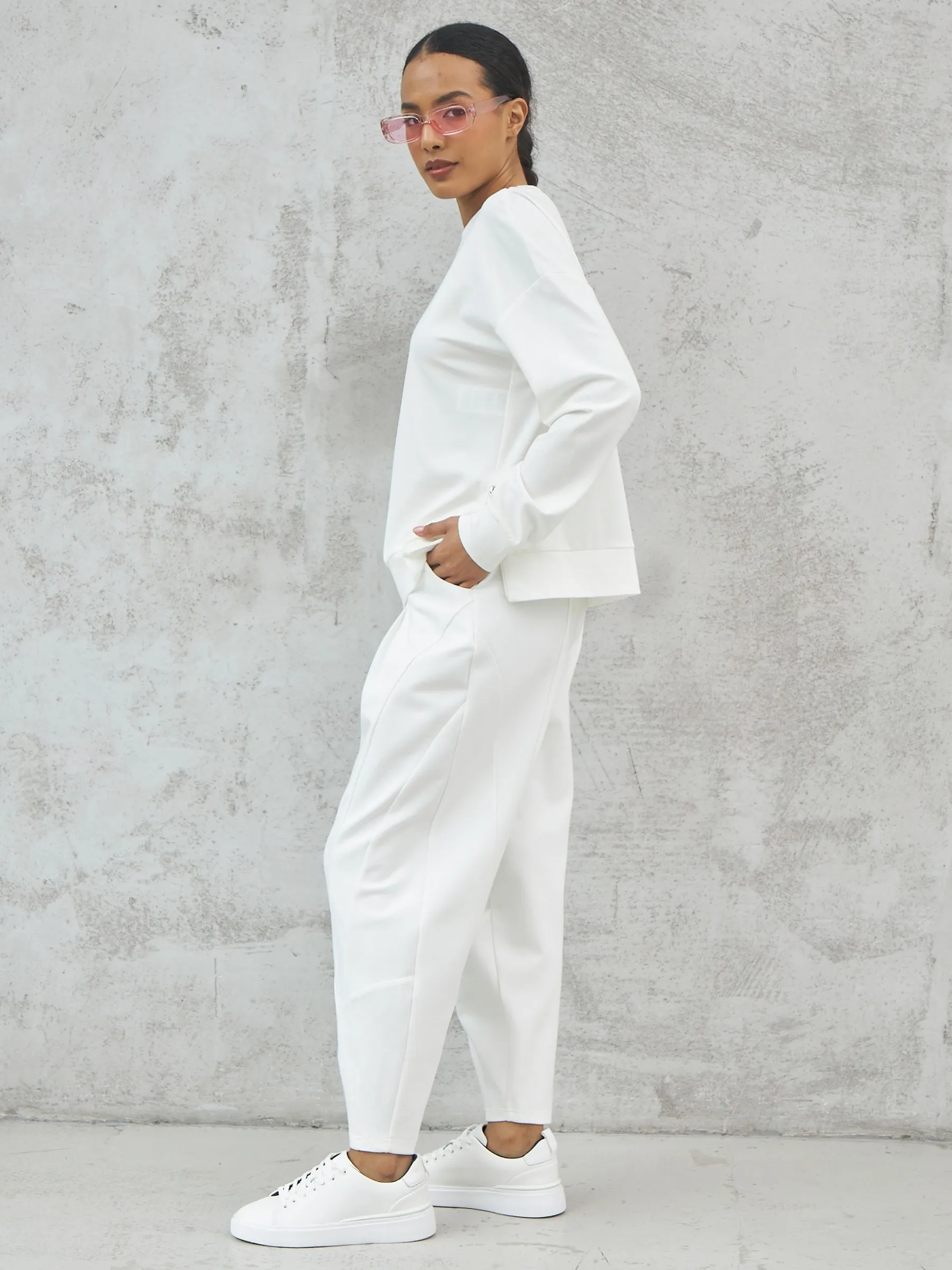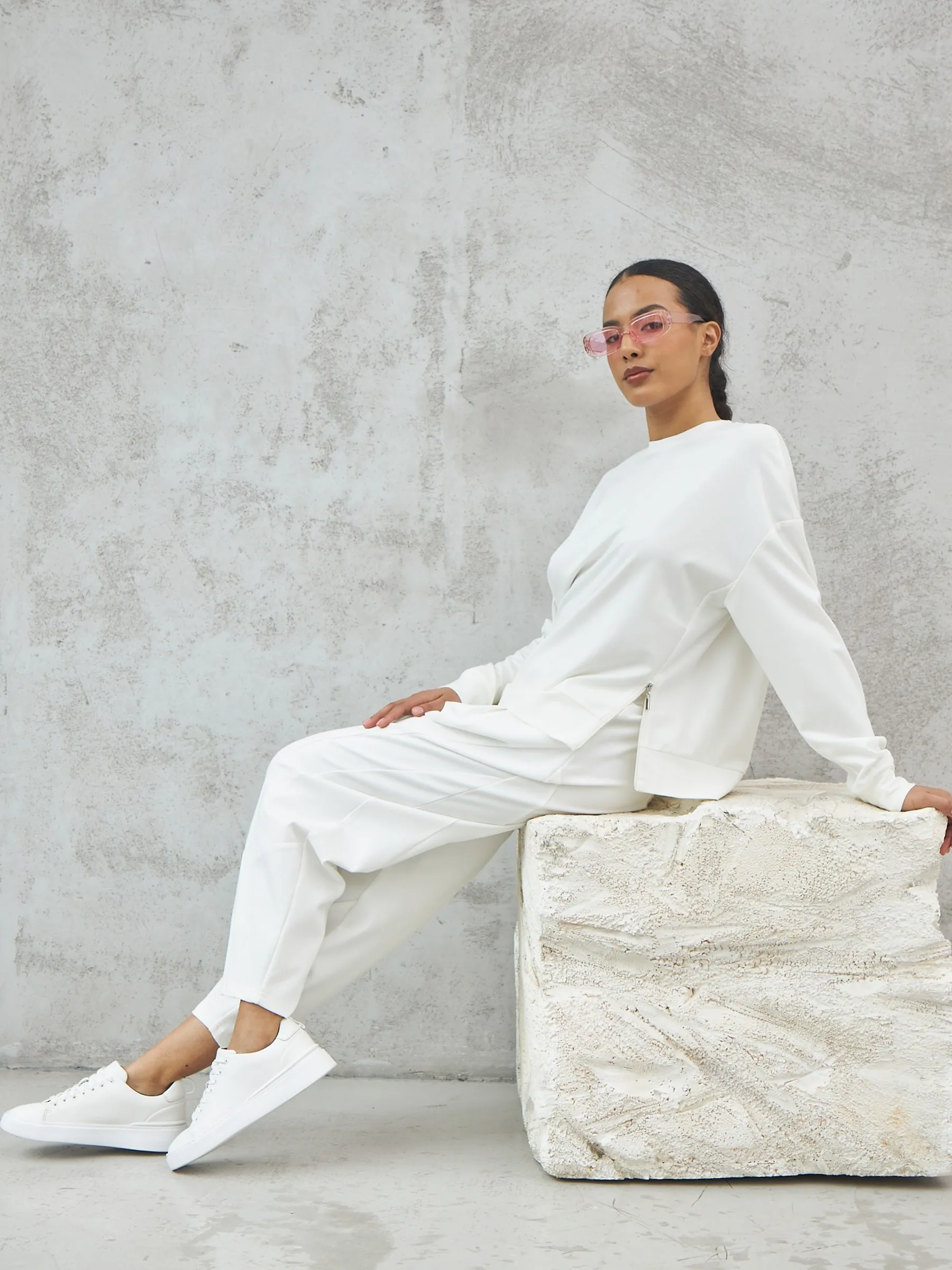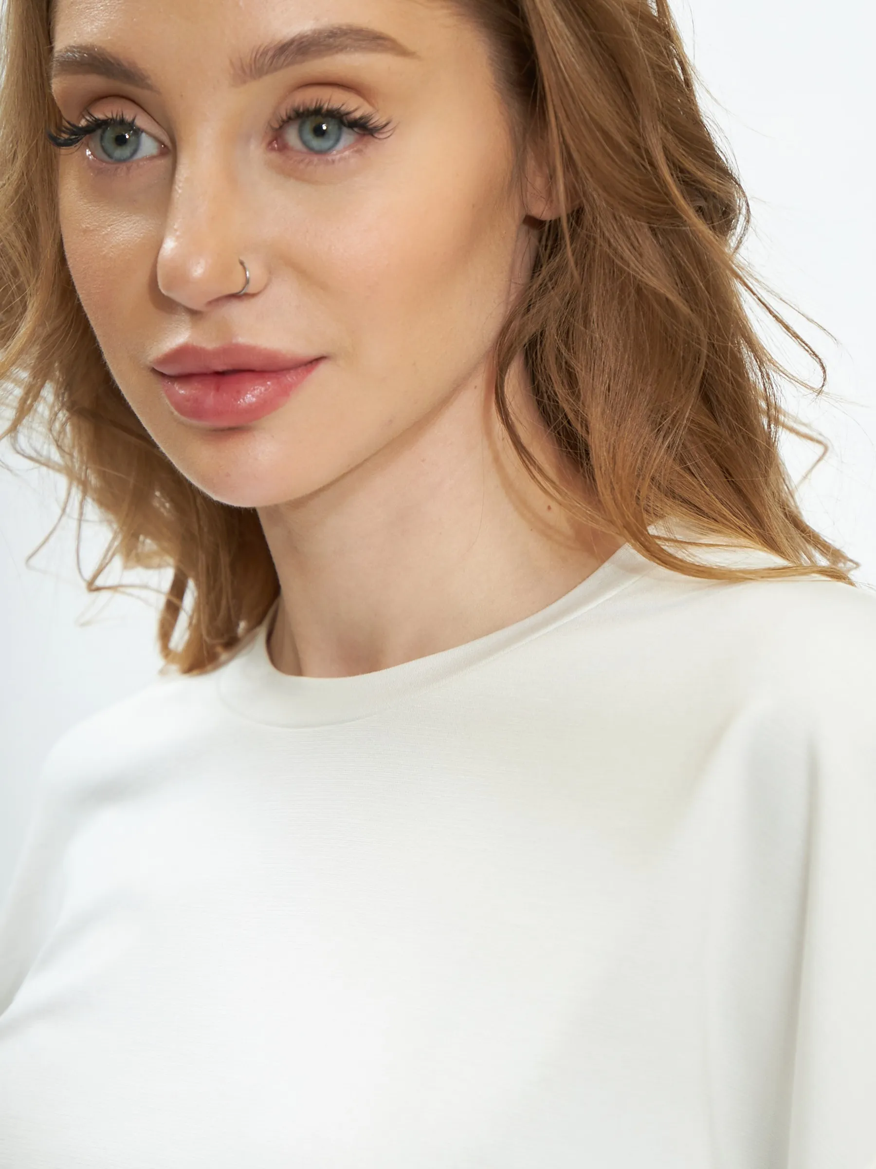Мягкий свитшот с круглым вырезом, широкими манжетами и двумя декоративными молниями сбоку, которые вы можете носить как в застегнутом, так и в расстегнутом виде. Модель выполнена из нежной вискозы, прочного нейлона и тянущегося эластана в молочном оттенке. Подойдет для создания удобных повседневных сочетаний с кэжуал брюками.