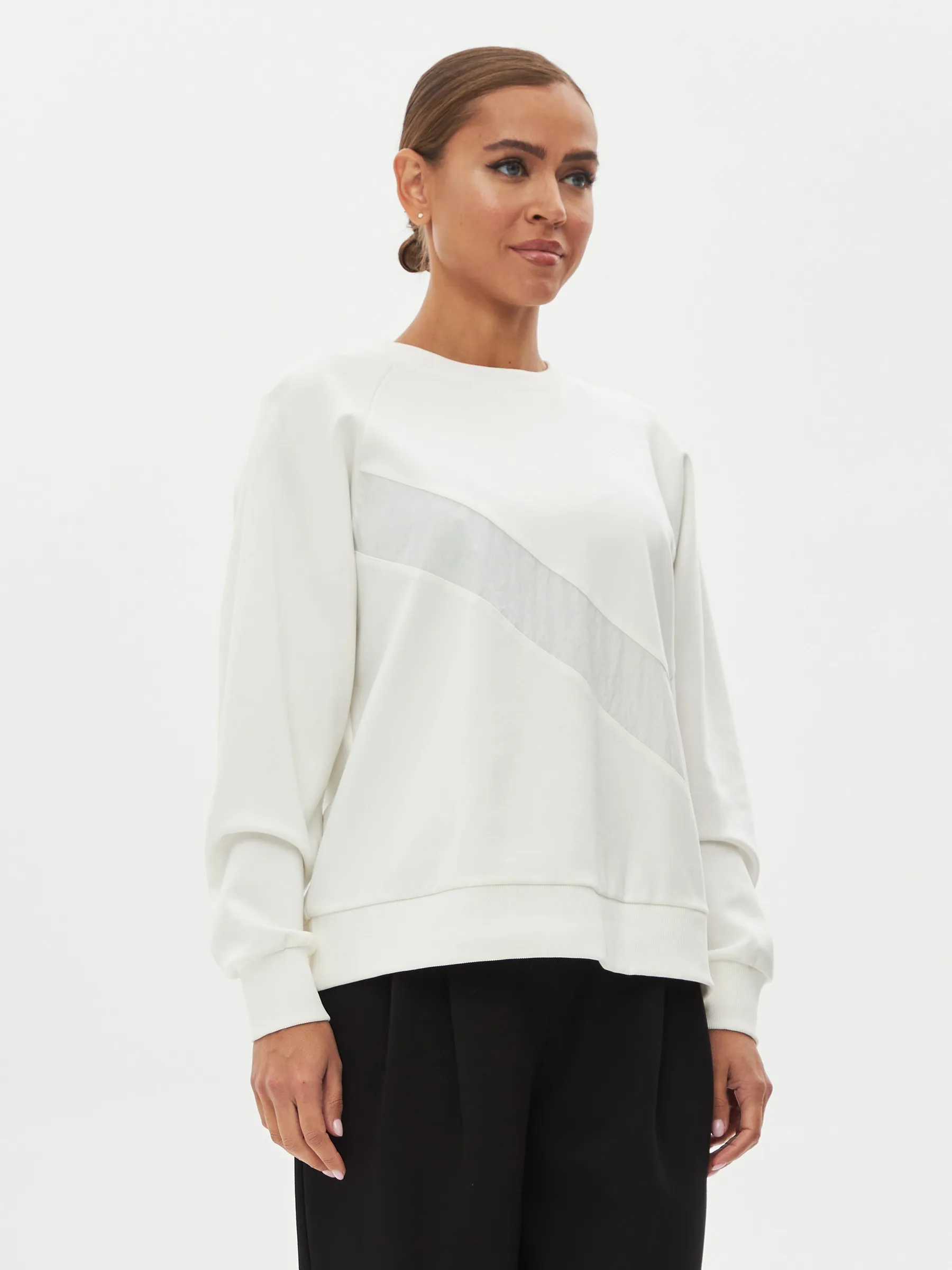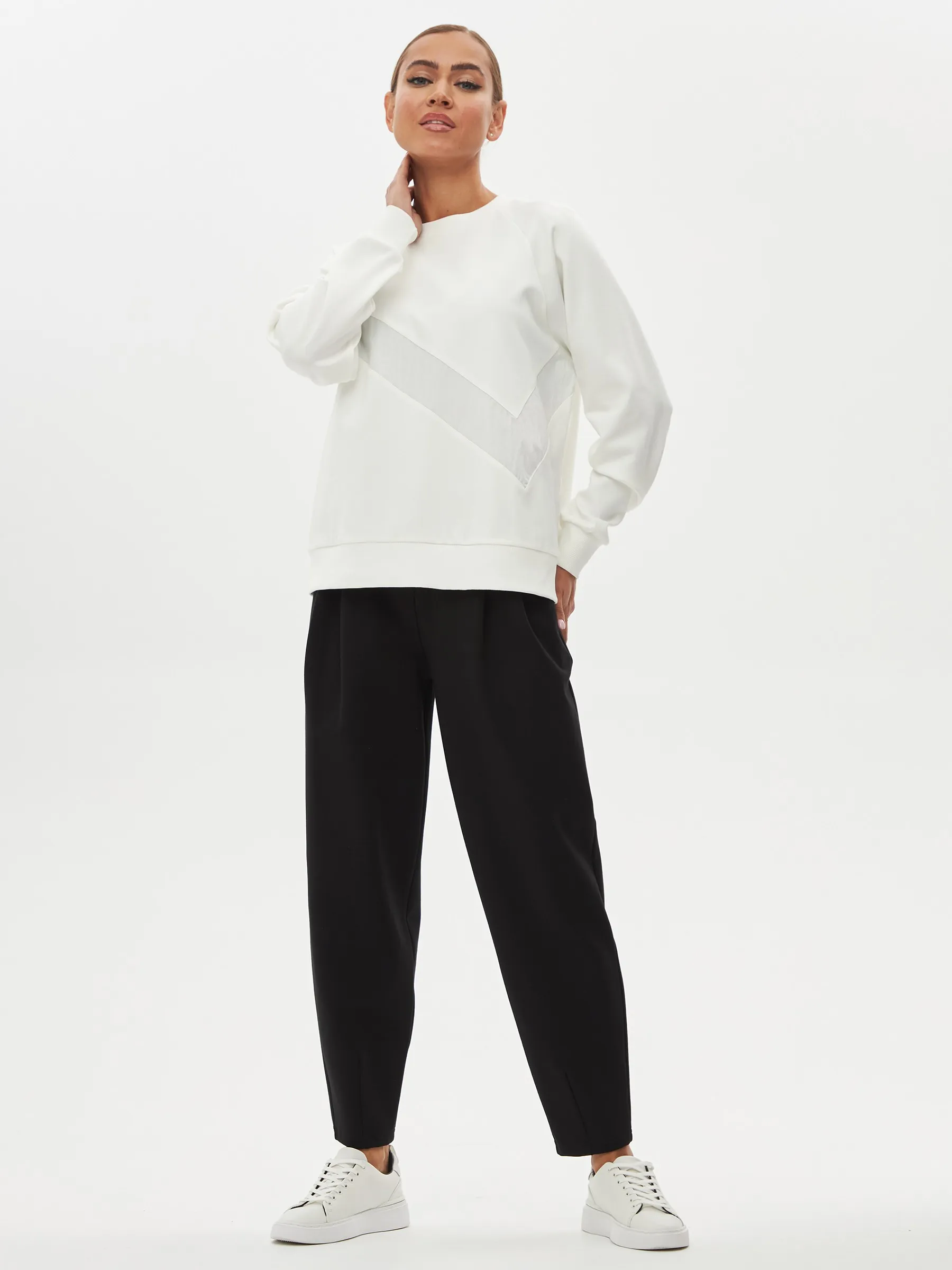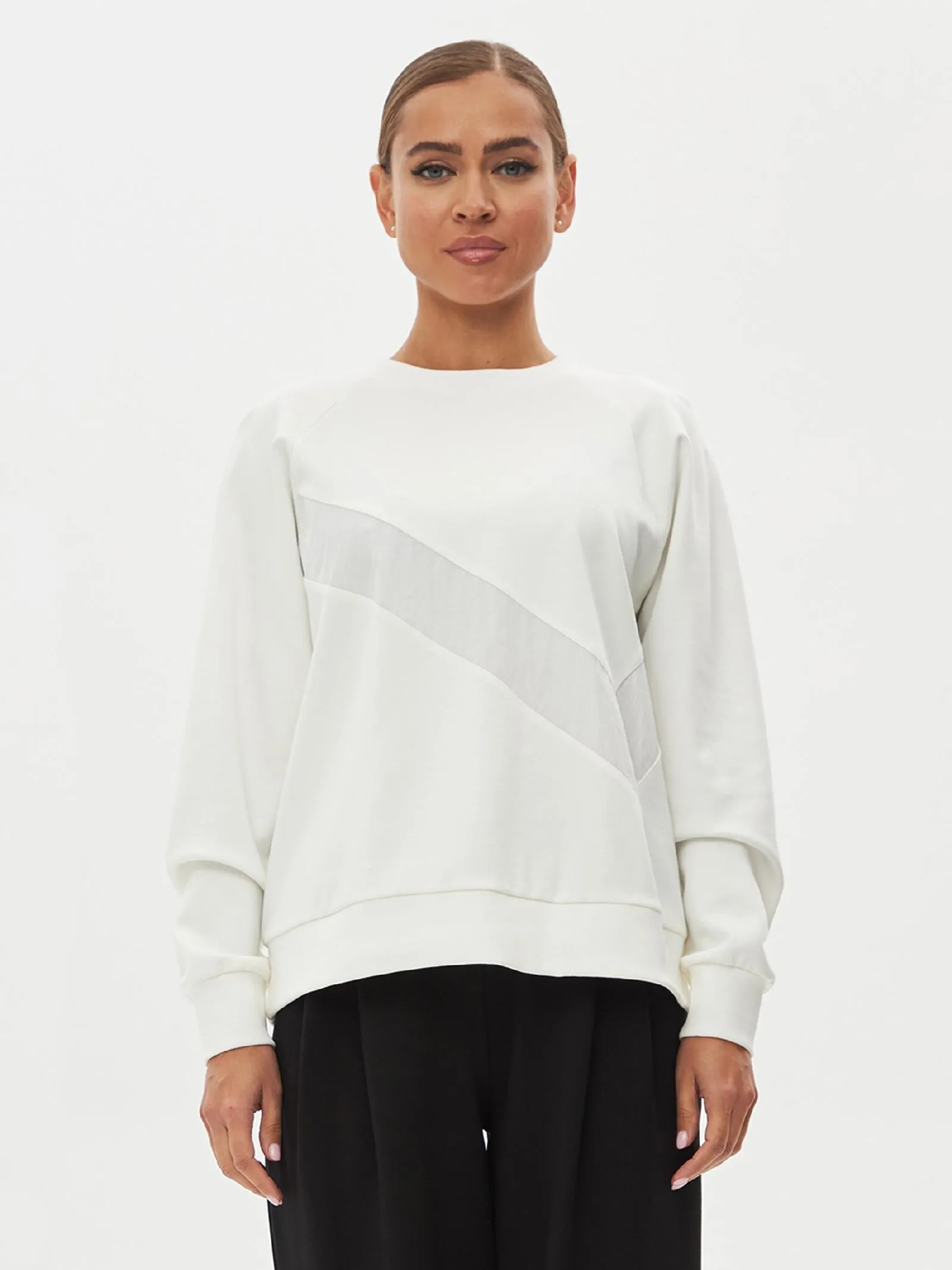 Свитшот, выполненный из качественного трикотажного полотна, обеспечивает комфорт и стиль. Модель имеет О-образный вырез горловины, который придаёт образу аккуратный вид. Длинные рукава-реглан обеспечивают свободу движений и добавляют динамичности силуэту. По низу рукавов расположены манжеты, которые обеспечивают хорошую посадку и комфорт в носке. На груди находится вставка из отделочного материала, добавляющая интересный акцент и уникальность дизайну. Этот свитшот станет отличным выбором для повседневного гардероба, идеально сочетаясь с джинсами или с брюками из нашего каталога.