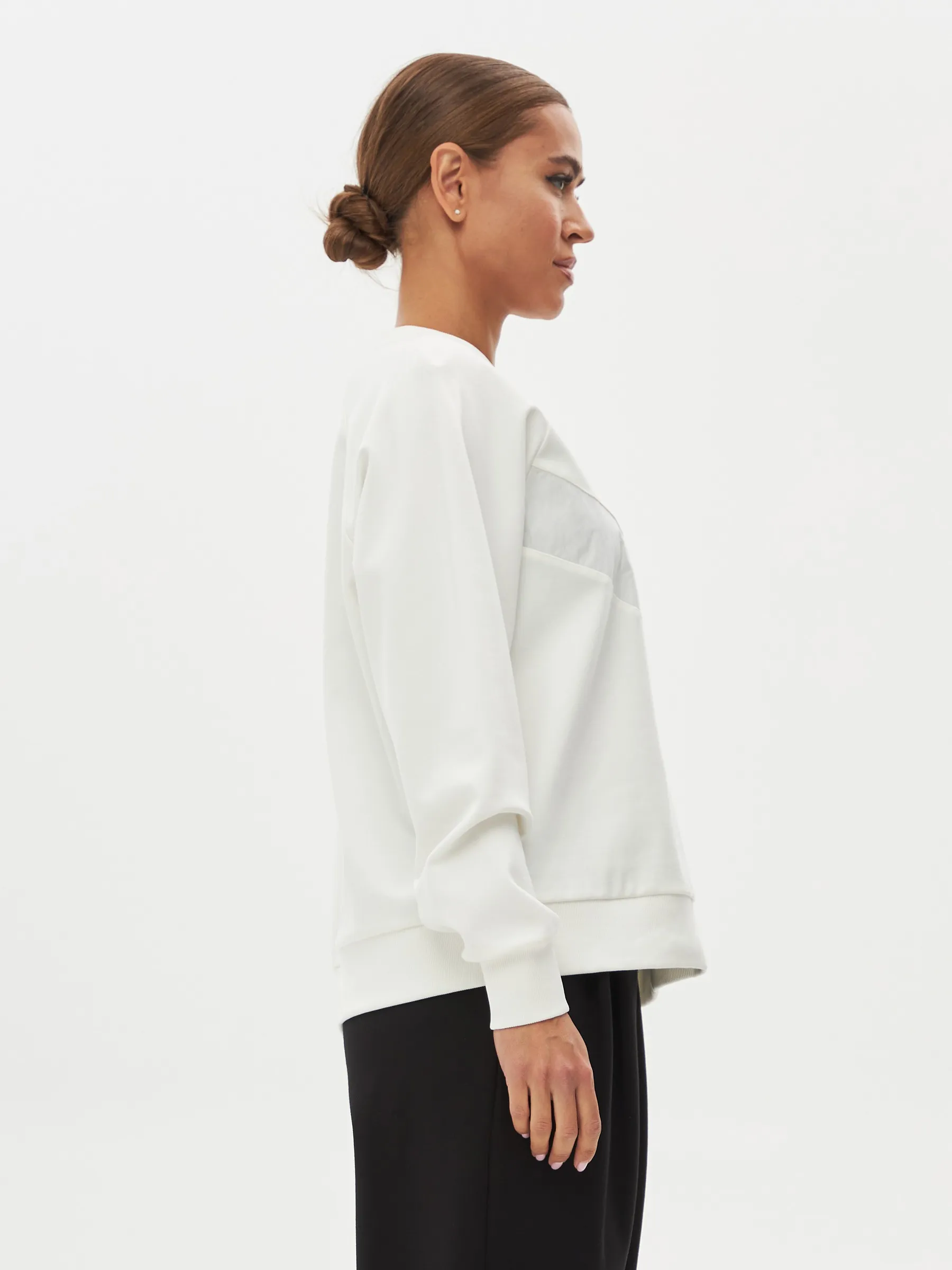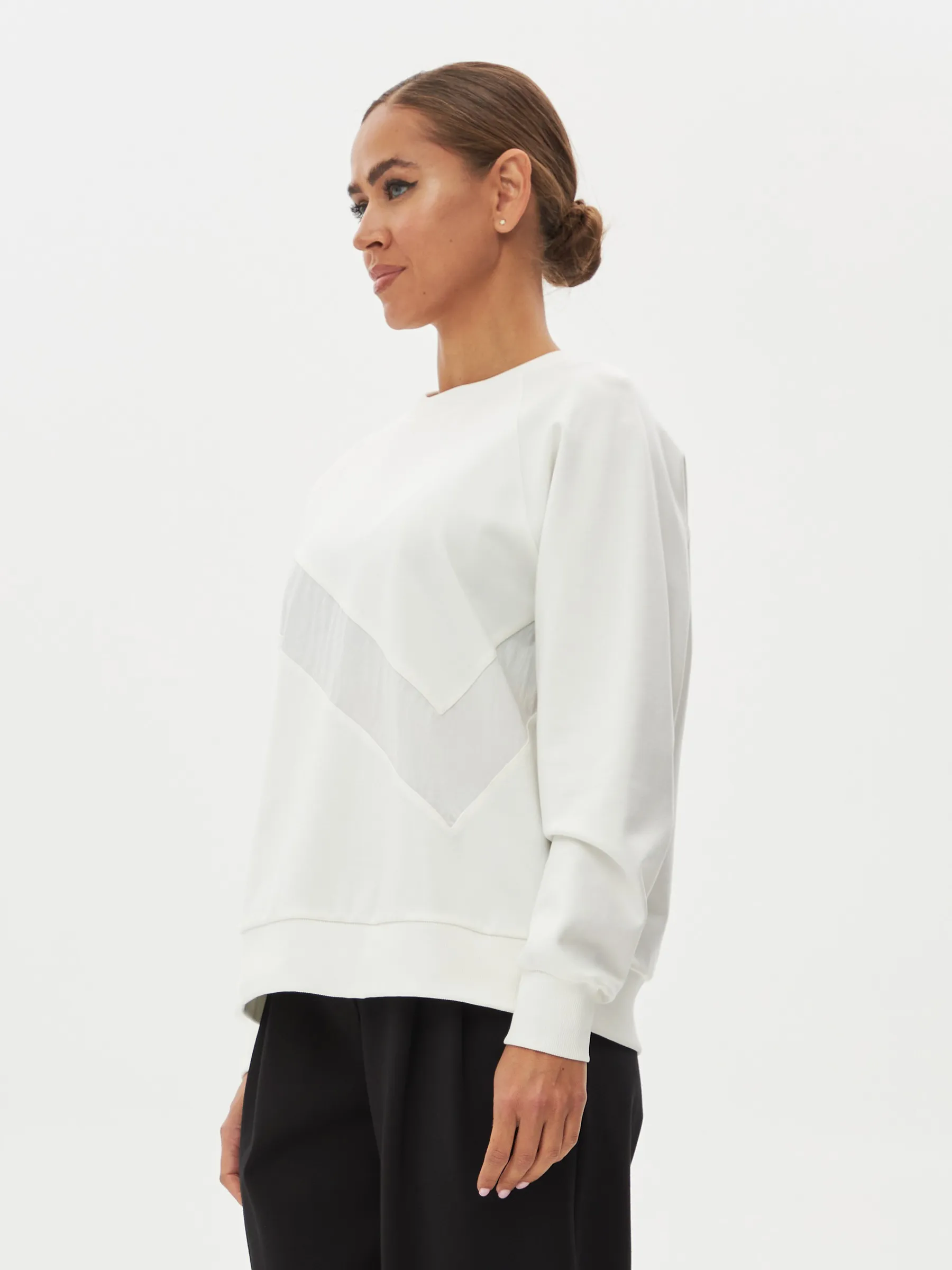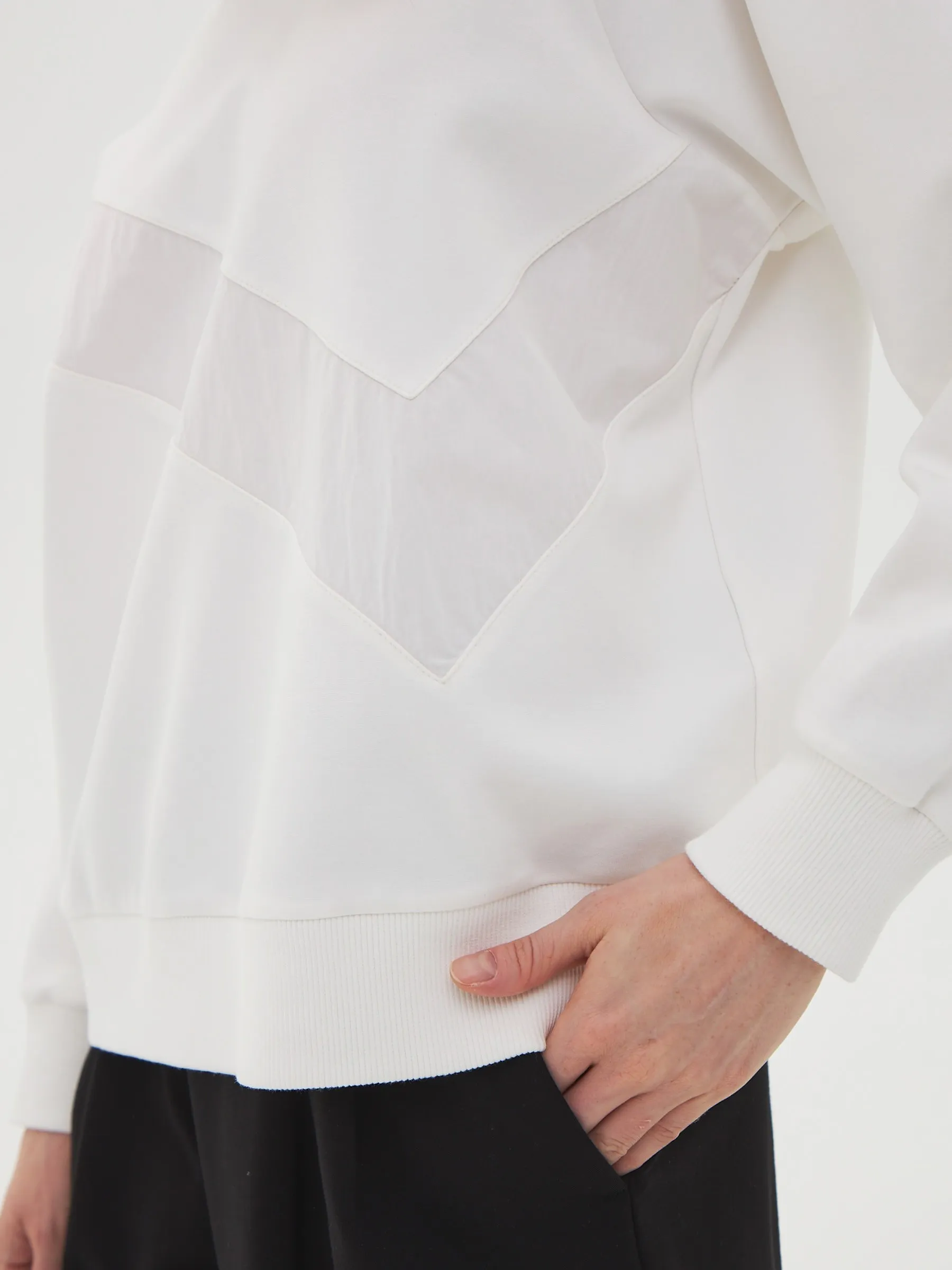 Свитшот, выполненный из качественного трикотажного полотна, обеспечивает комфорт и стиль. Модель имеет О-образный вырез горловины, который придаёт образу аккуратный вид. Длинные рукава-реглан обеспечивают свободу движений и добавляют динамичности силуэту. По низу рукавов расположены манжеты, которые обеспечивают хорошую посадку и комфорт в носке. На груди находится вставка из отделочного материала, добавляющая интересный акцент и уникальность дизайну. Этот свитшот станет отличным выбором для повседневного гардероба, идеально сочетаясь с джинсами или с брюками из нашего каталога.