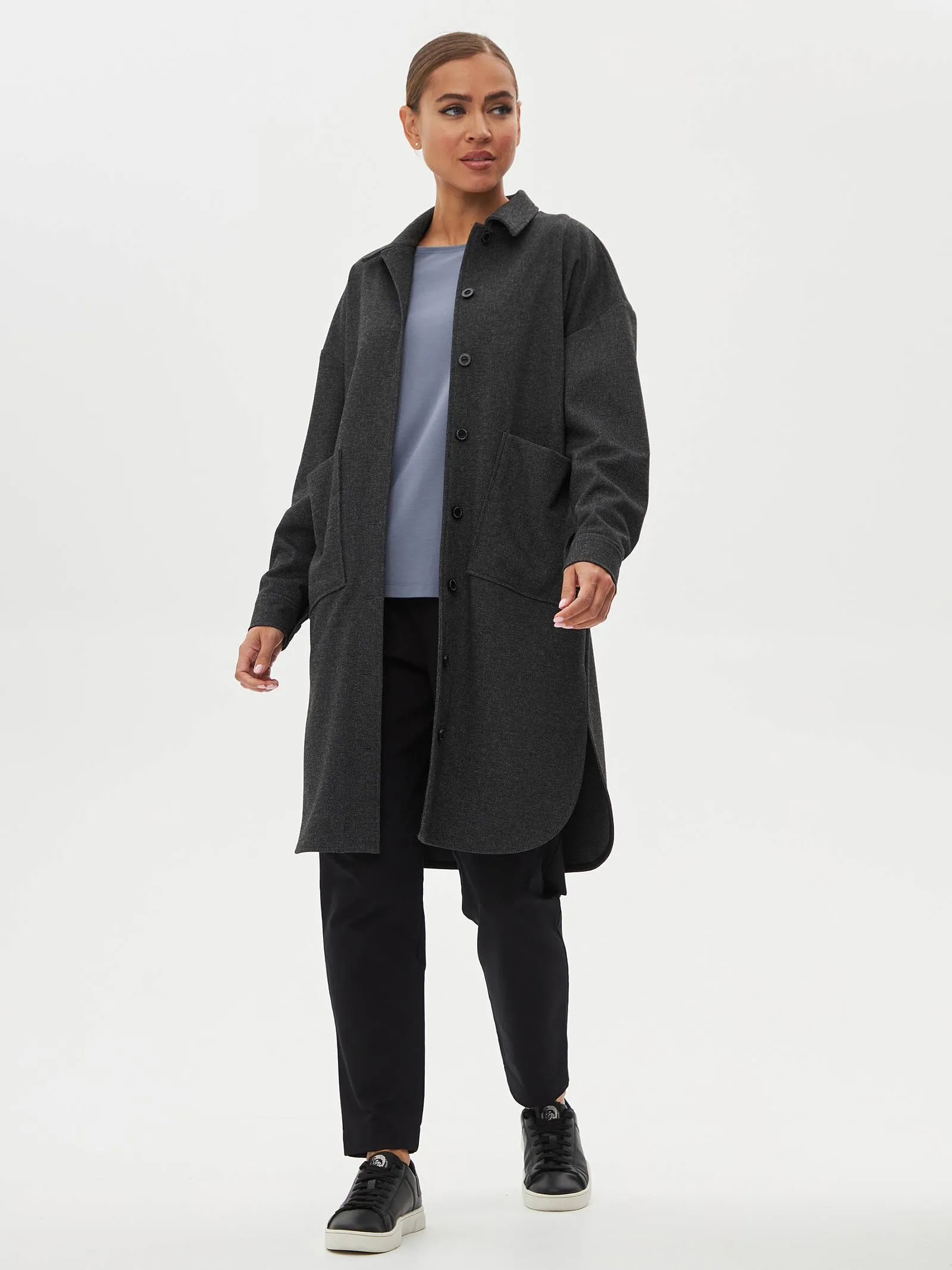 Пальто-рубашка прямого кроя на пуговицах. Удобные накладные карманы. Платье выполнено из мягкой, почти немнущейся ткани. Фасон позволяет носить его как легкое пальто.
