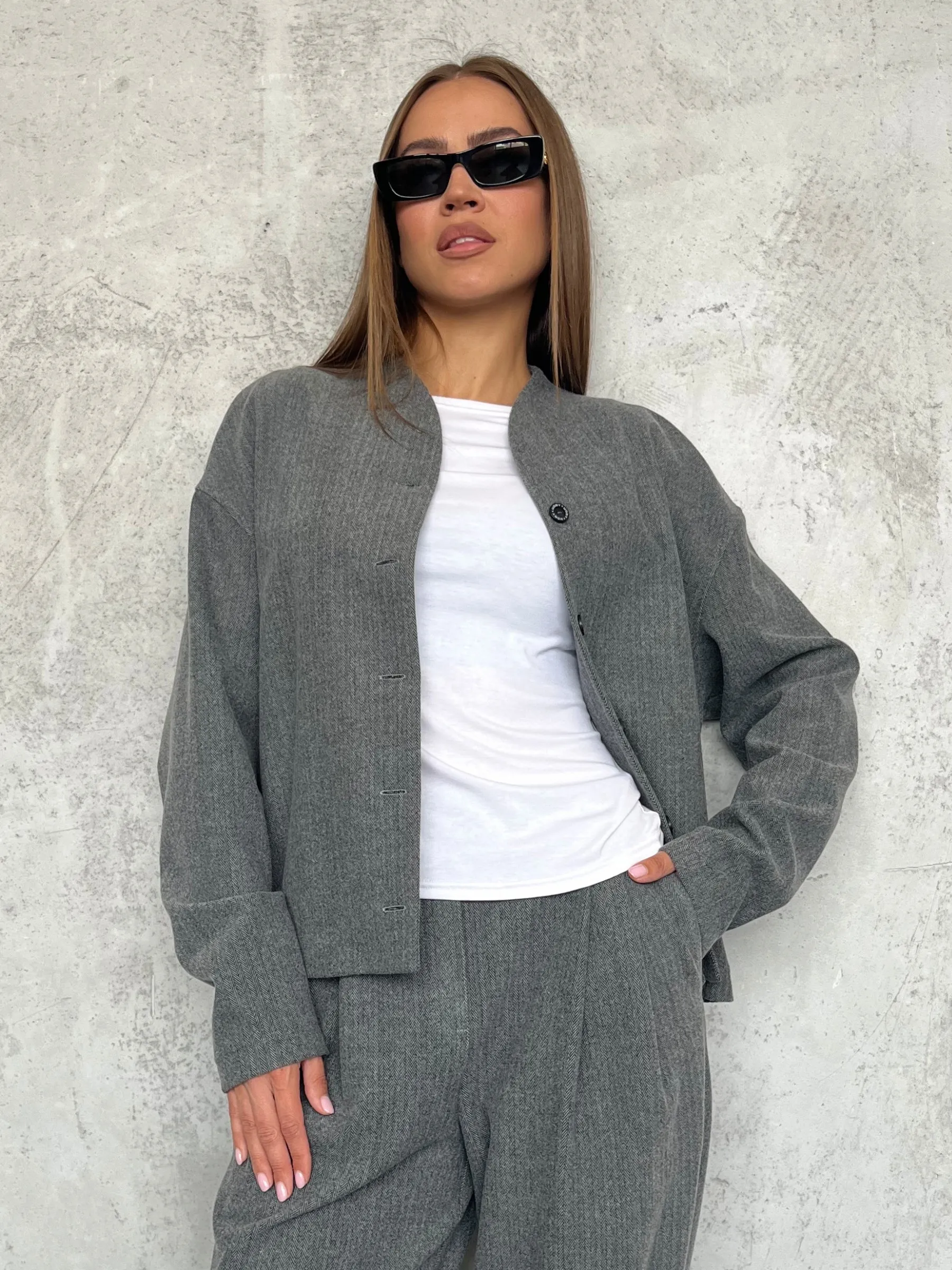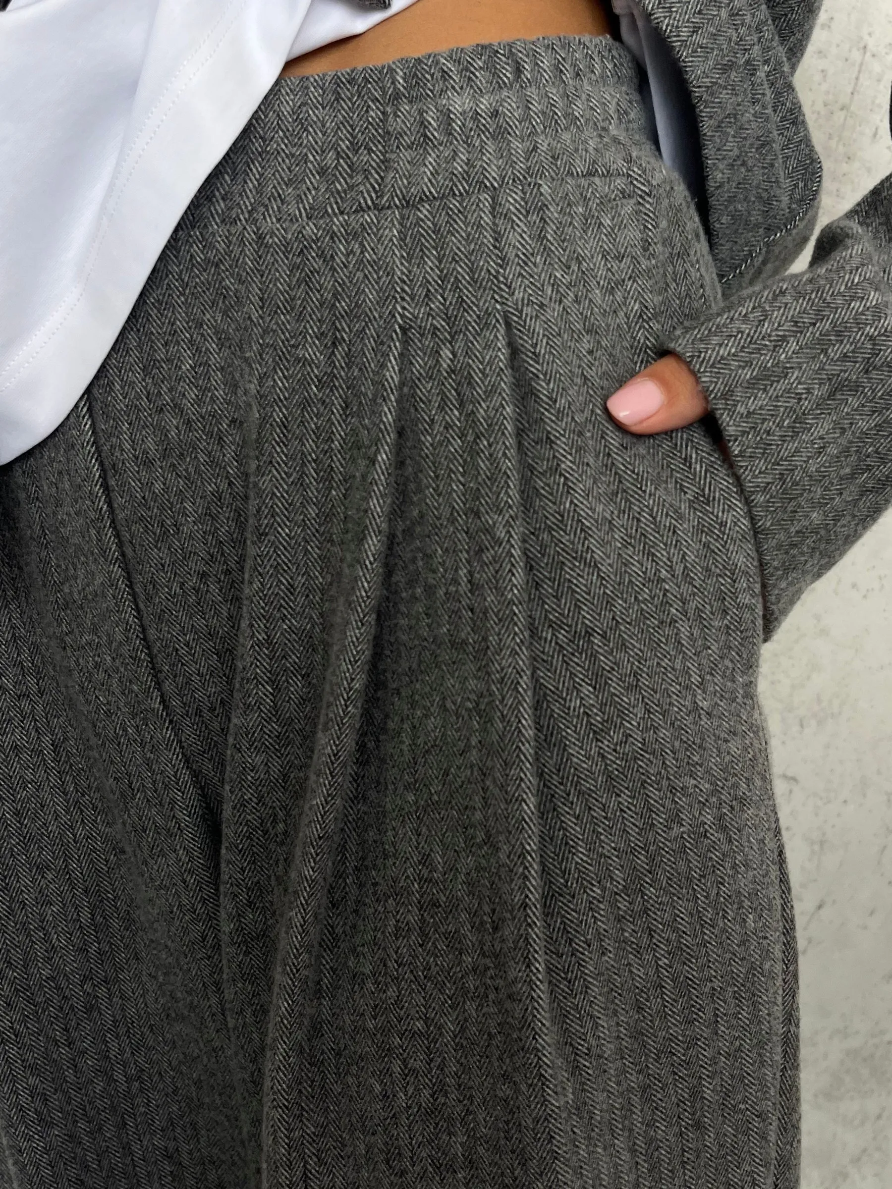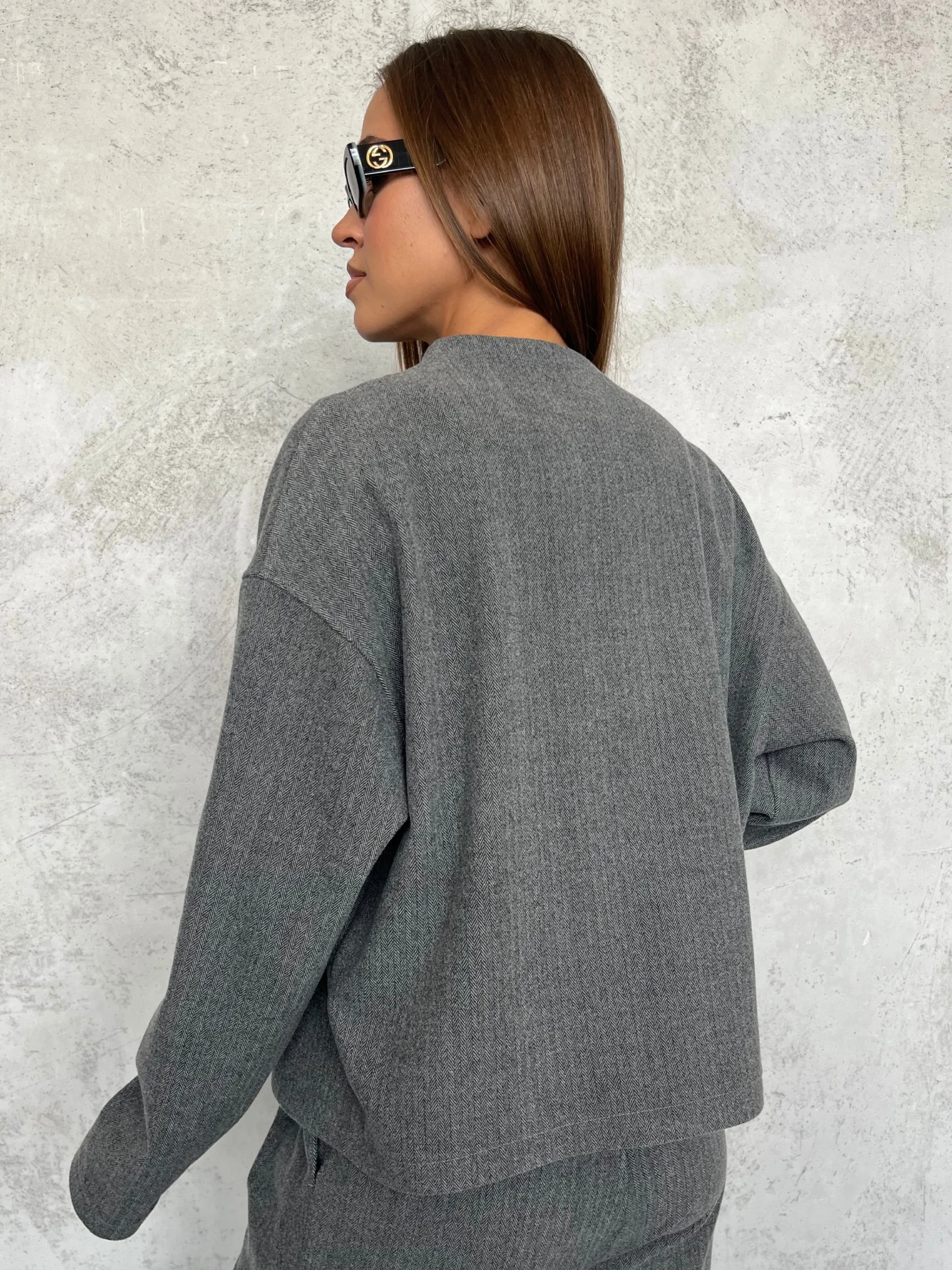 Ткань костюмная «ёлочка» с благородной фактурой. В составе есть шерсть, поэтому жакет отлично подходит для осени, зимы и ранней весны. Вискоза добавляет мягкости, полиэстер практичности, а эластан комфорта в движении. Материал держит форму и приятен к телу.