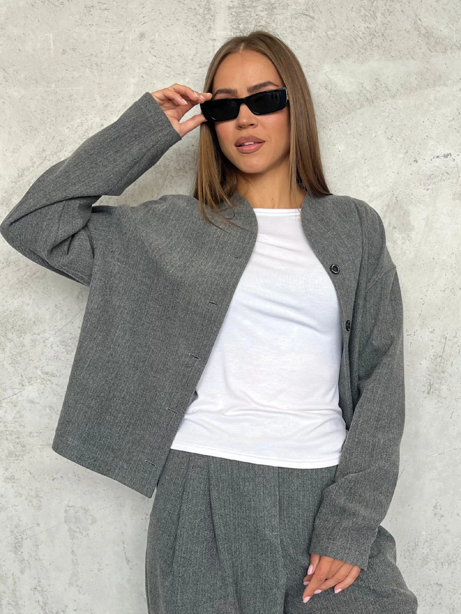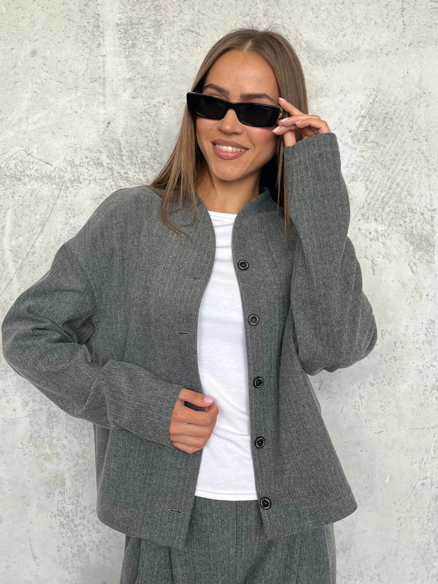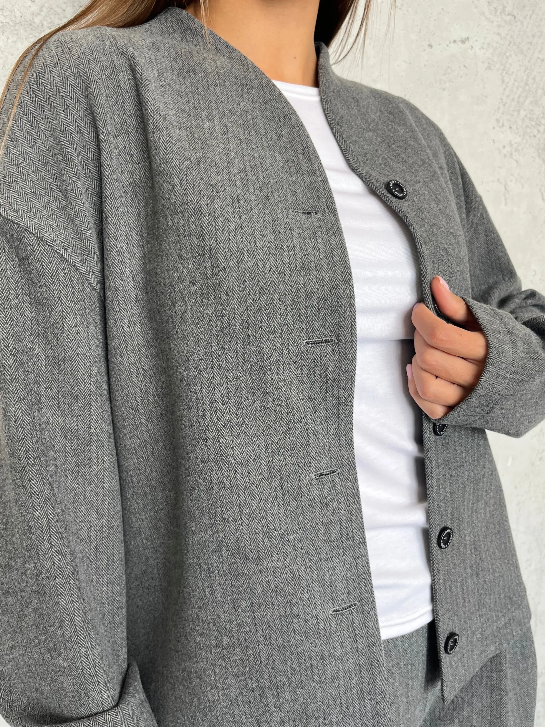 Жакет свободного кроя с мягкими, аккуратными линиями и фигурным воротником, который красиво подчёркивает шею и плечи. Застёжка на пуговицах выглядит сдержанно и не перегружает силуэт.