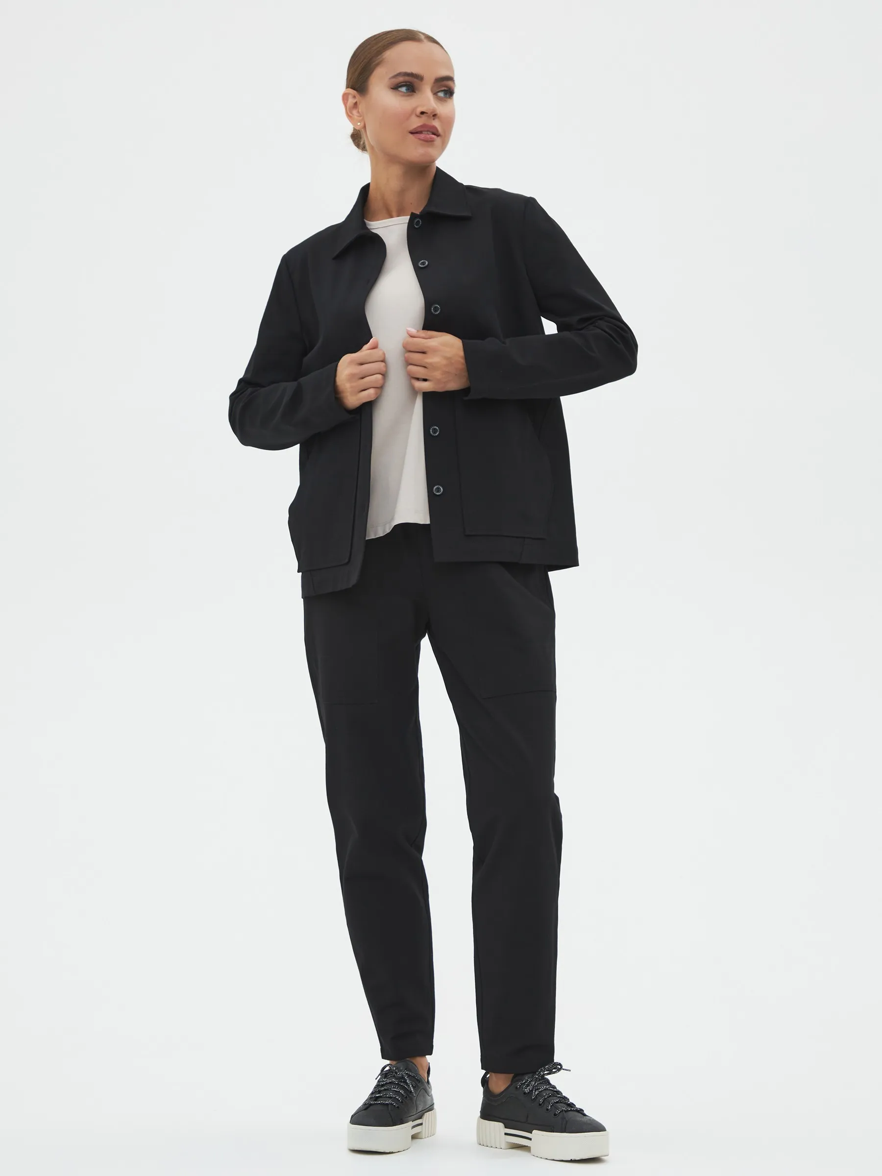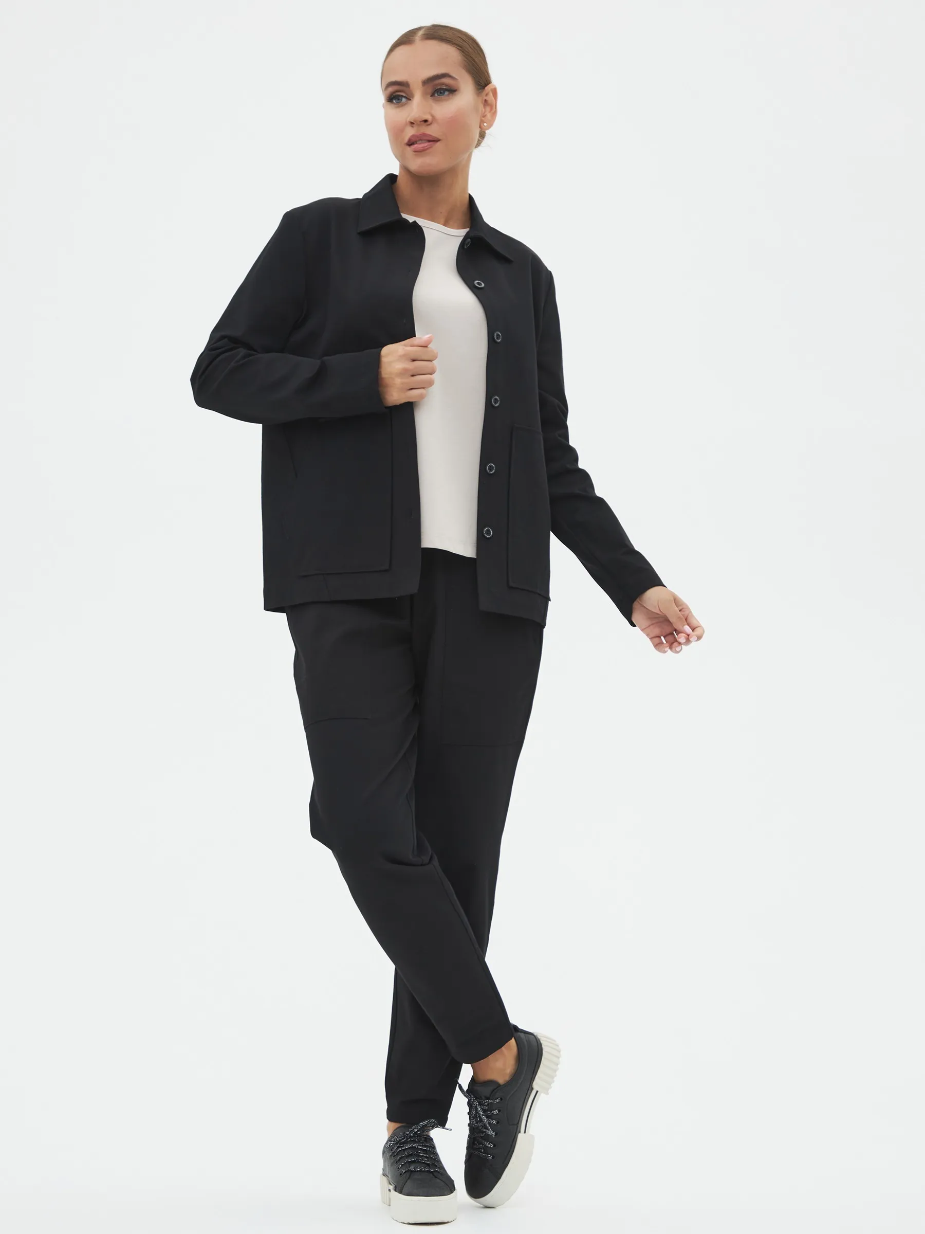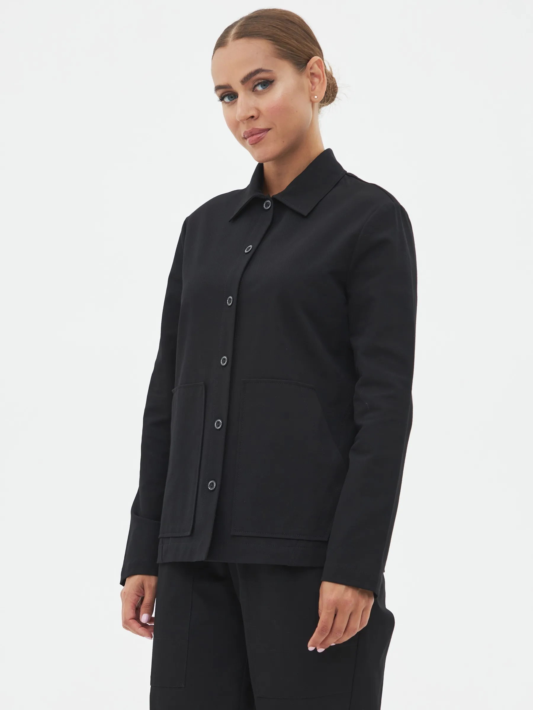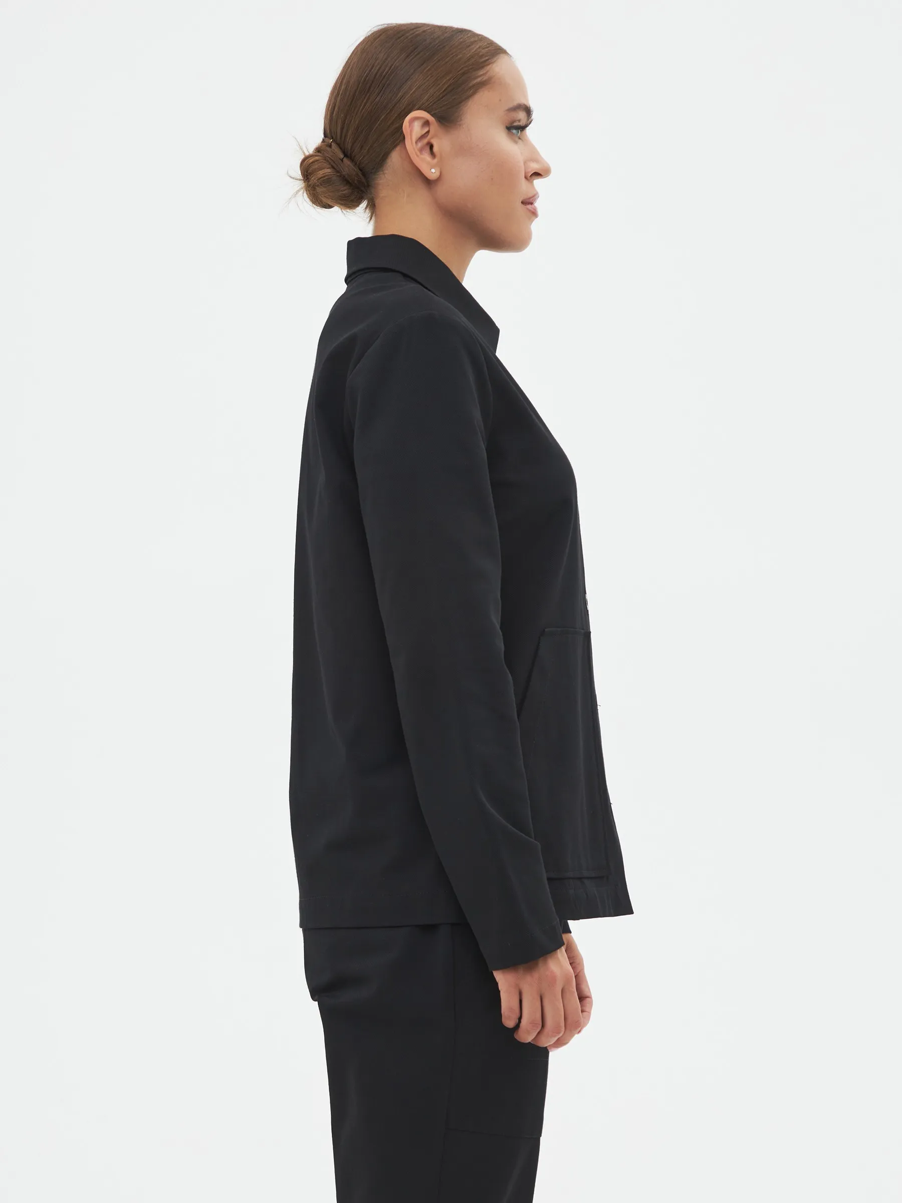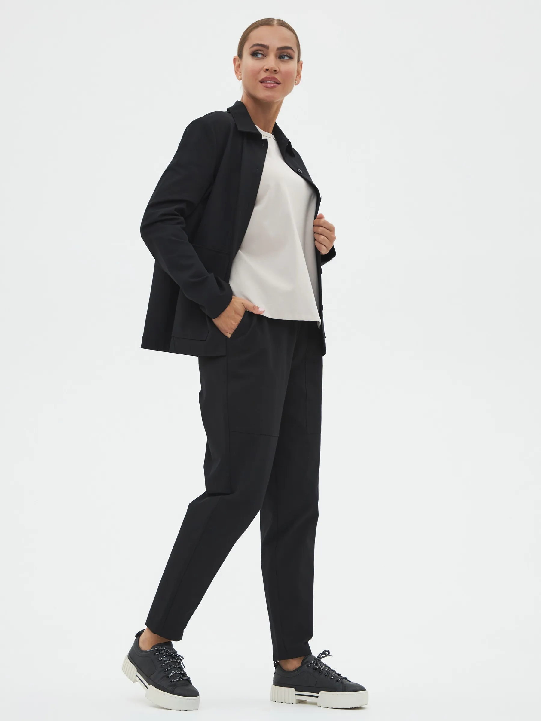 Жакет с длинным рукавом, отложным воротником, оригинальными карманами в геометрическом стиле и узкими изящными манжетами. Модель выполнена из ткани премиального качества в чёрном цвете, в составе которой мягкий органический хлопок, прочный полиамид и тянущийся эластан. Подойдет для создания повседневных сочетания с футболками, свитшотами и брюками Gezalook by UDGY.