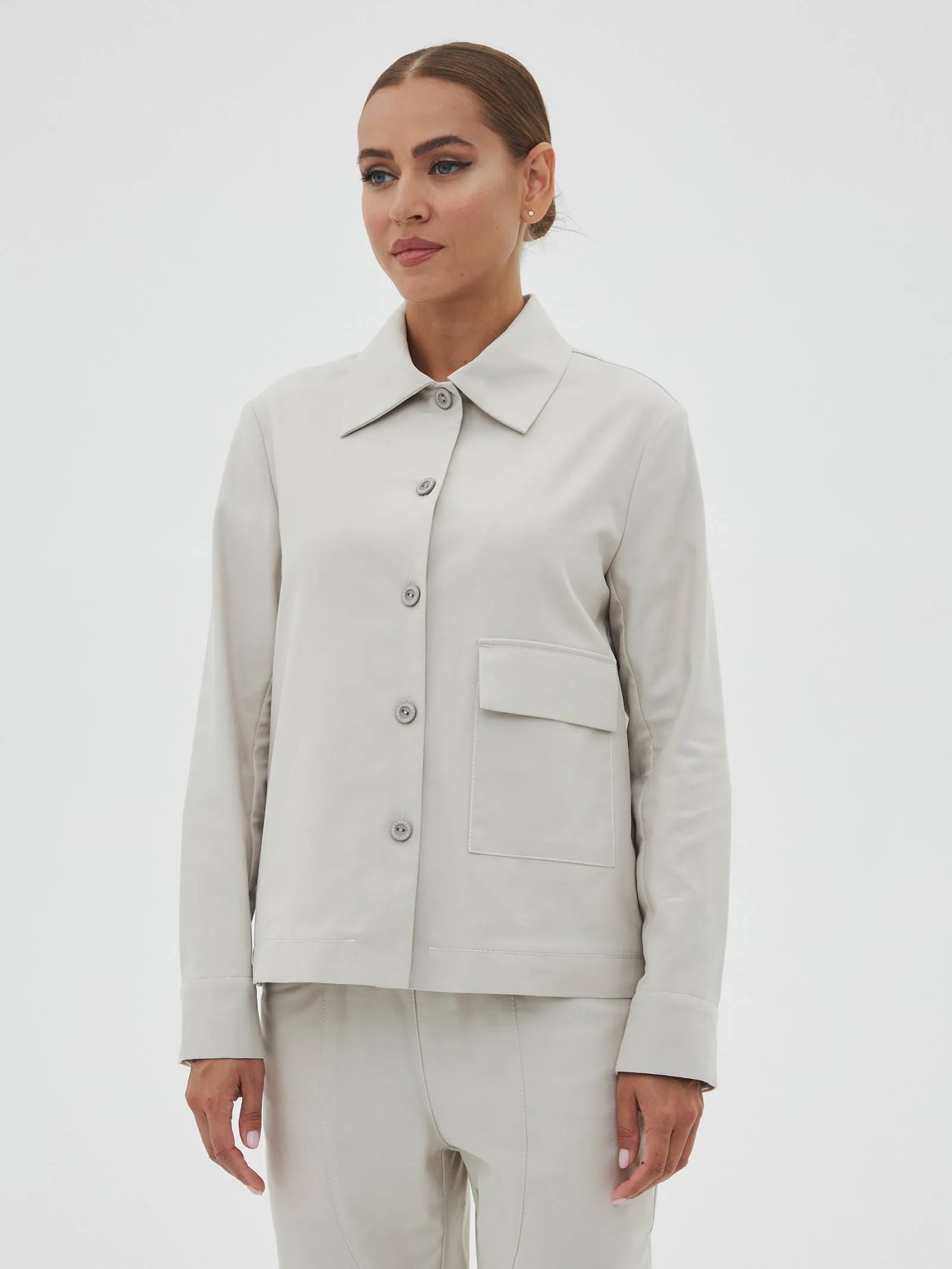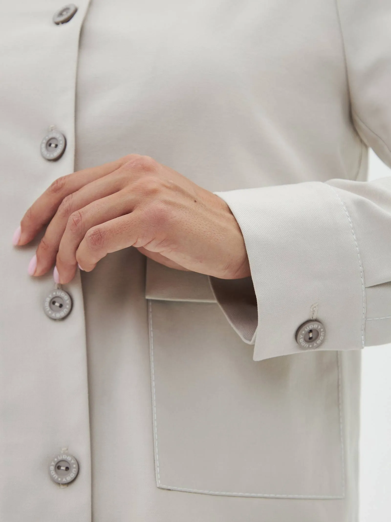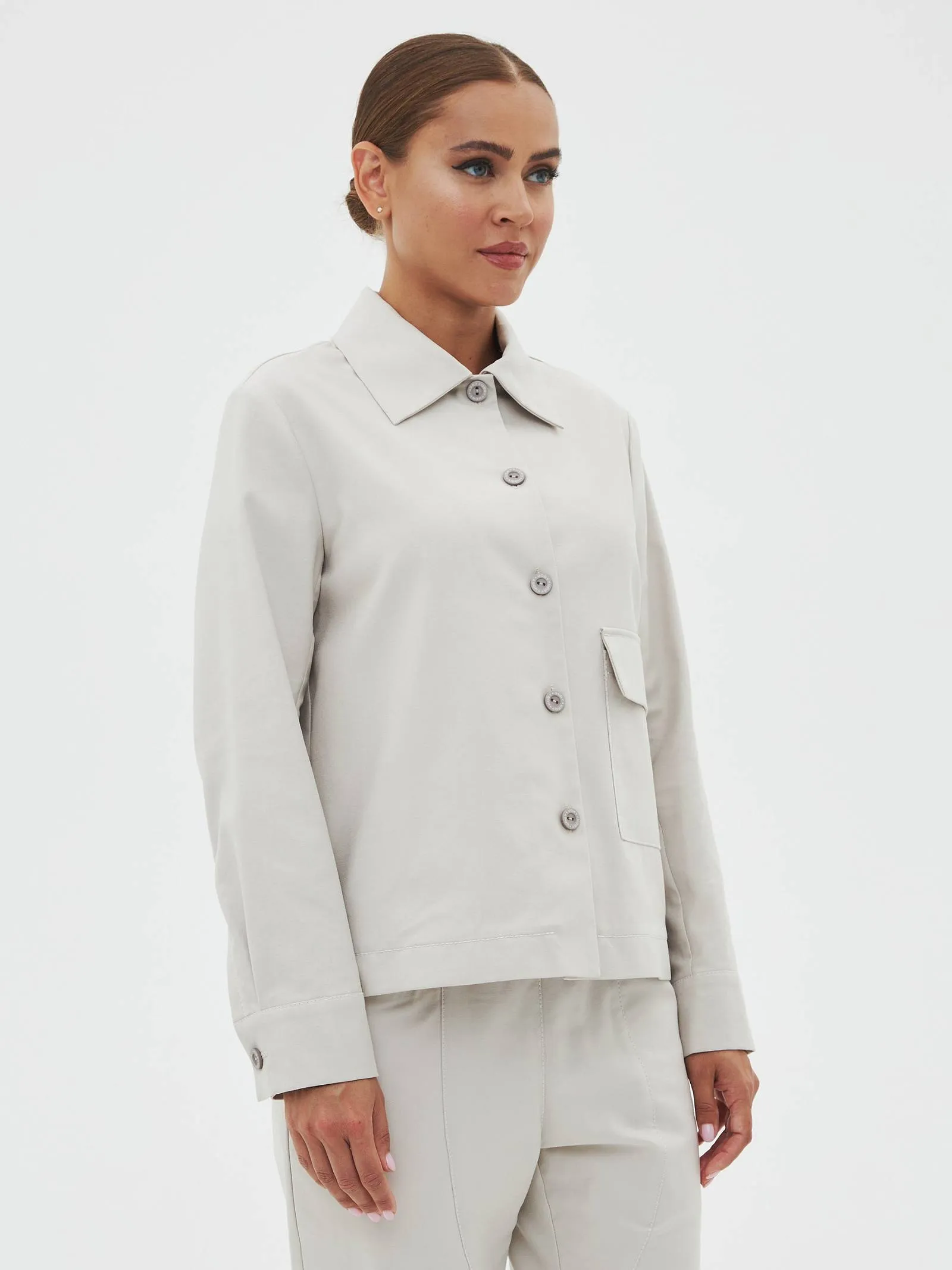 Жакет из шелковистого хлопка под джинсу средней плотности прямого силуэта с пуговицами стильный и универсальный элемент гардероба. Изделие оснащено отложным воротником с прямыми концами, который придаёт модели классический и утончённый вид. Длинные рукава дополнены аккуратными манжетами, застёгивающимися на пуговицы, что обеспечивает удобство и добавляет образу изысканности. На левой стороне жакета расположен функциональный накладной нагрудный карман с клапаном. Такой жакет легко впишется как в деловой, так и в повседневный гардероб, подчёркивая индивидуальность и хороший вкус.