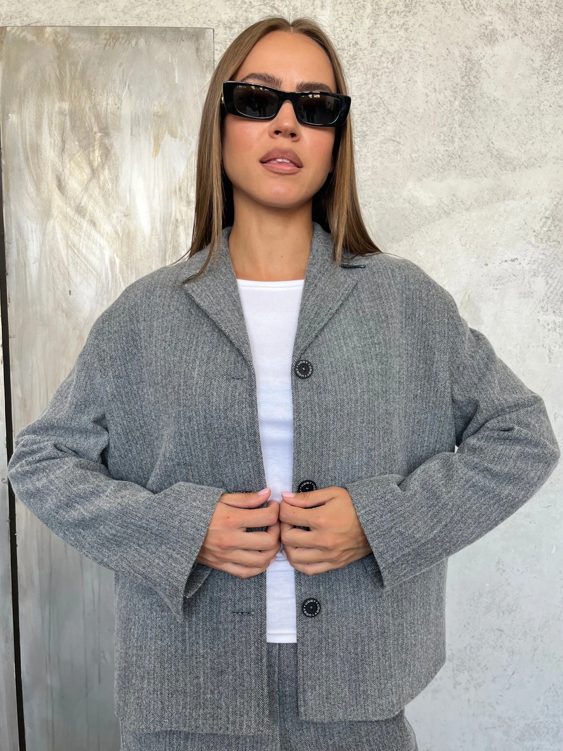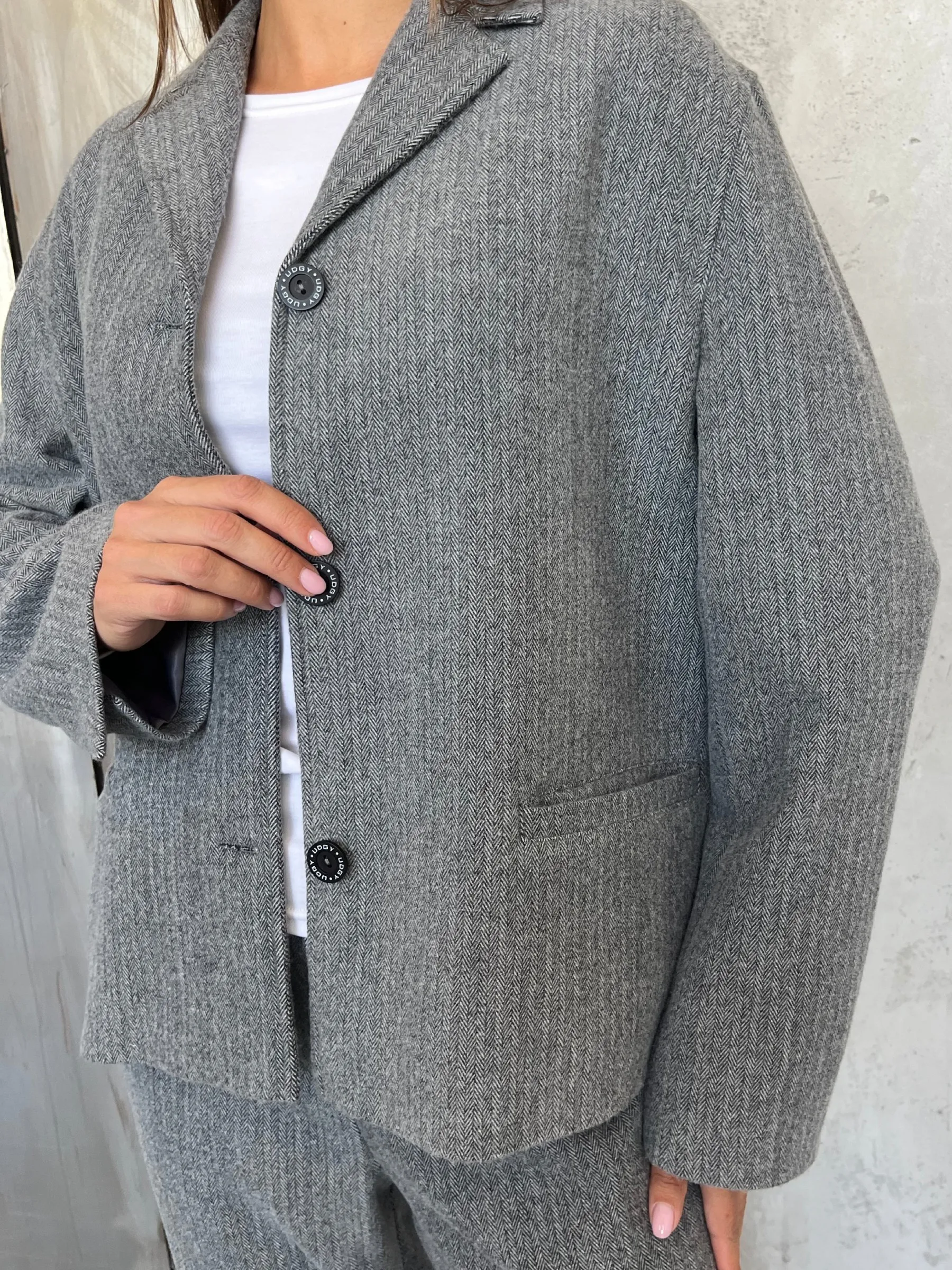 Ткань костюмная «ёлочка» мягкая и приятная на ощупь, а шерсть в составе дарит тепло и уют, делая жакет идеальным для прохладных дней. Карманы с клапанами добавляют практичности, а шелковистая подкладка приятно скользит по телу, обеспечивая комфорт и свободу движений жакет легко садится и не сковывает.