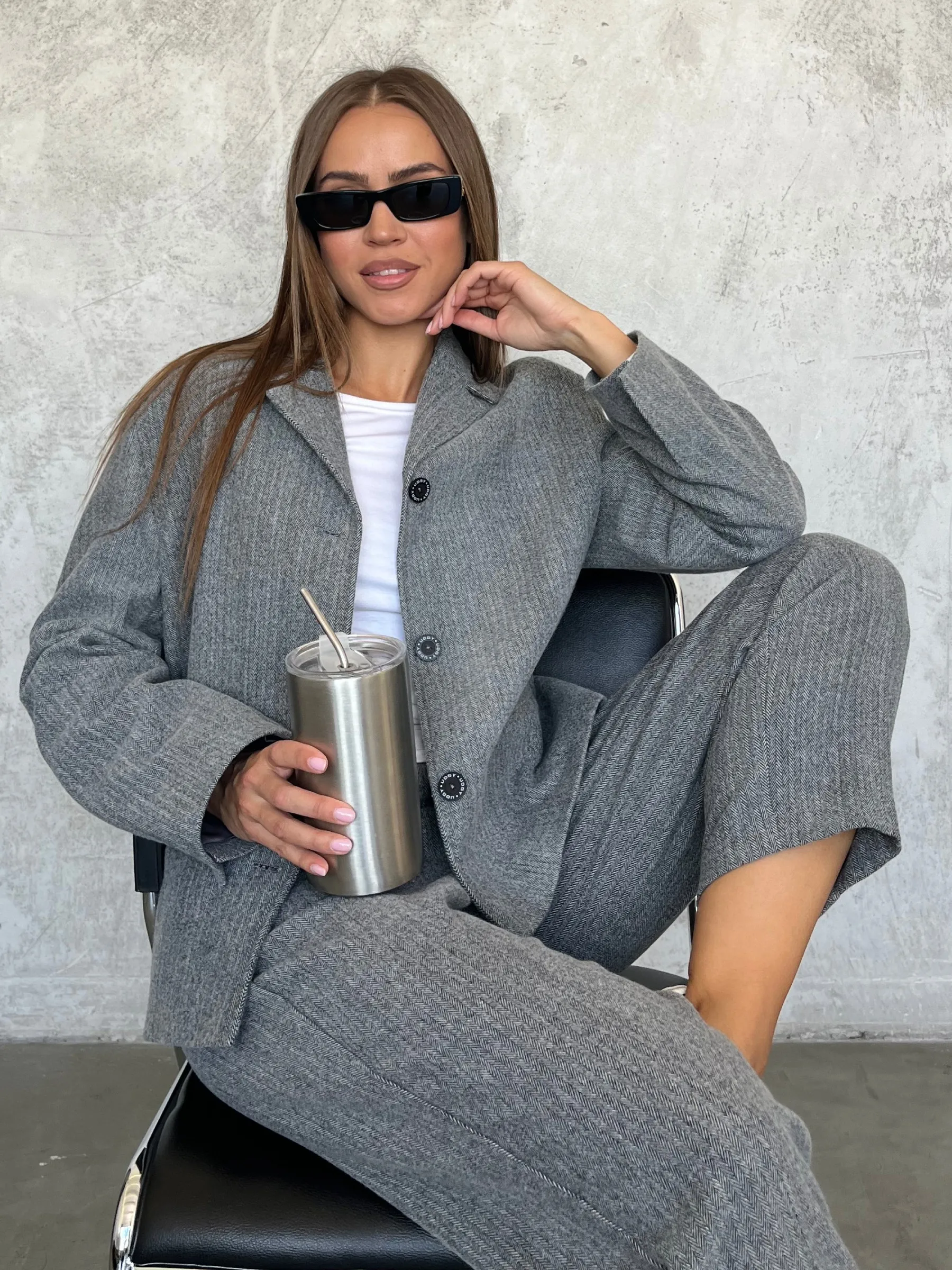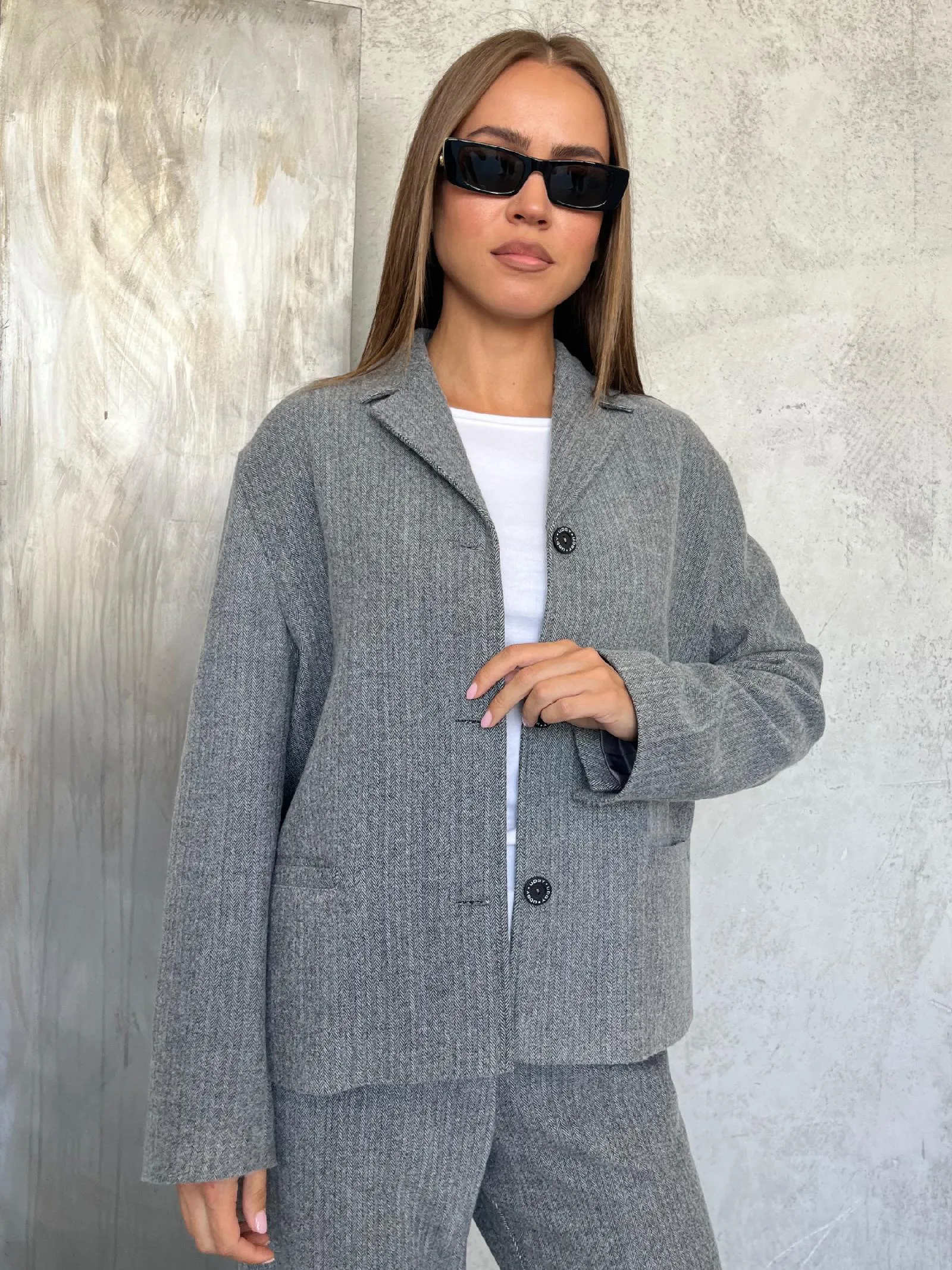 Жакет свободного кроя с отложенным воротником аккуратно подчёркивает линию шеи и придаёт образу завершённость. Застёжка на пуговицах поддерживает классический силуэт и делает модель удобной в носке.